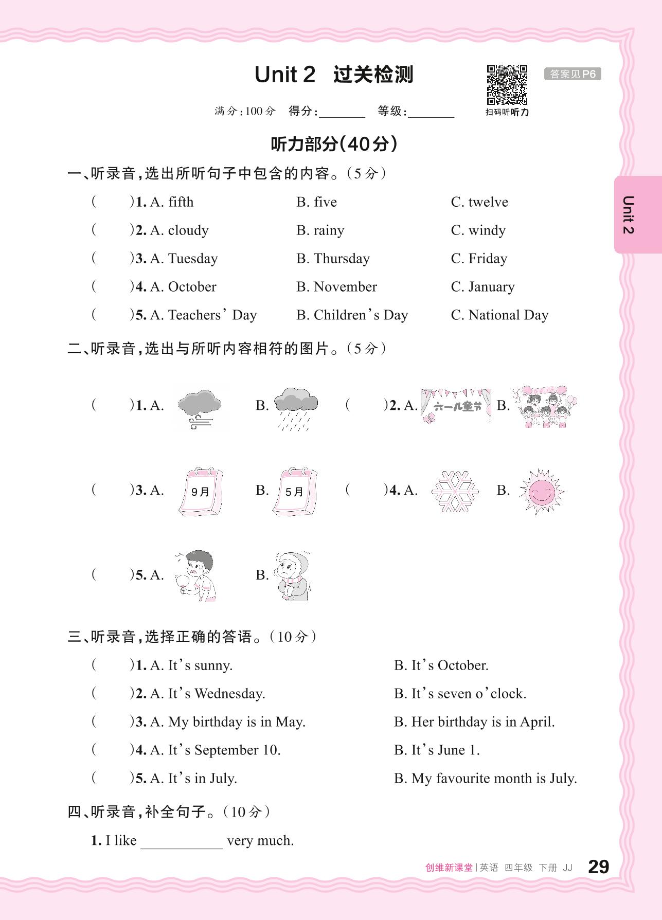 四年级英语冀教版下册单元卷