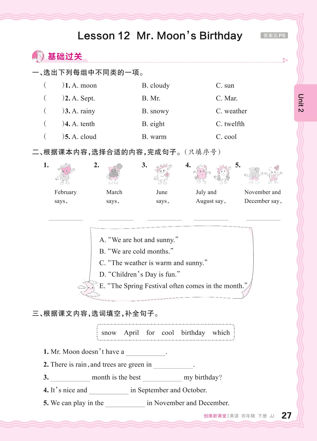 2024春下册四年级英语冀教版 Unit 2—Lesson 12 Mr.Moon's Birthday