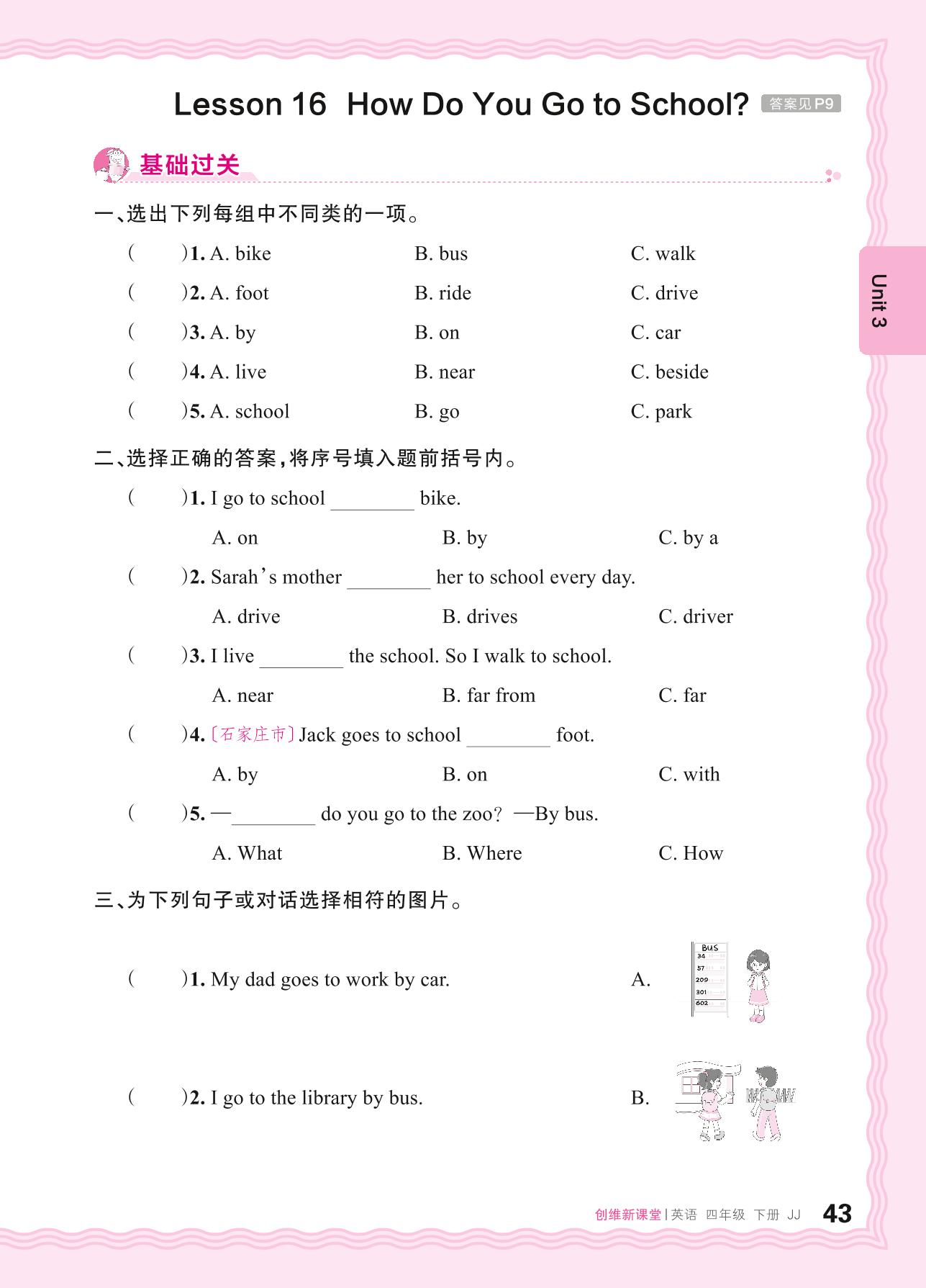2024春下册四年级英语冀教版 Unit 3—Lesson 16 How Do You Go to School?