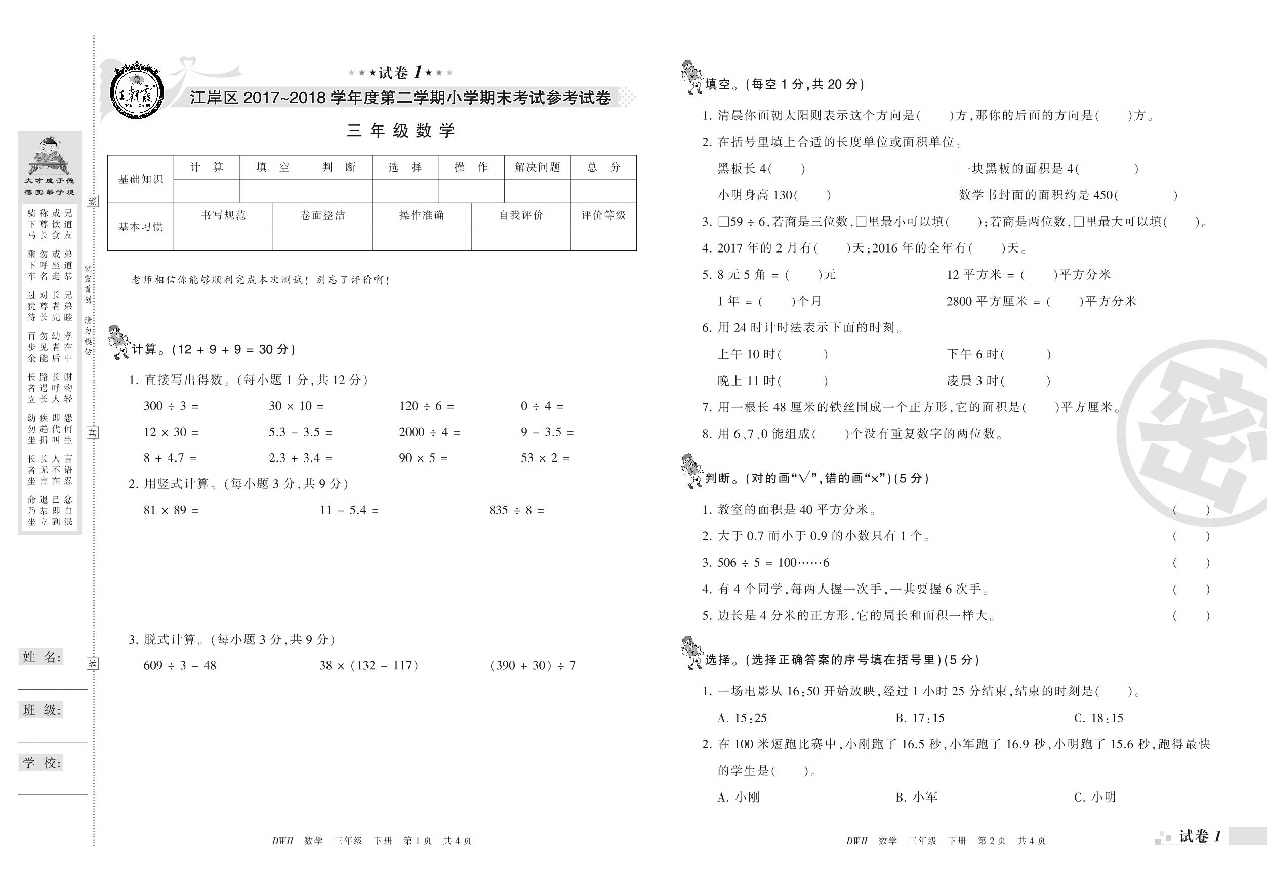 2017-2018学年第二学期武汉市江岸区三年级数学试卷(人教版)【1】