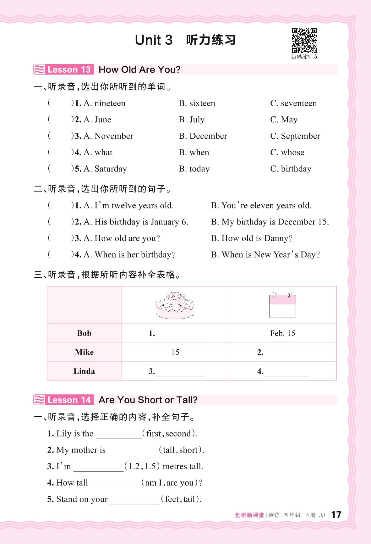 2024春下册四年级英语冀教版 Unit 3 听力练习
