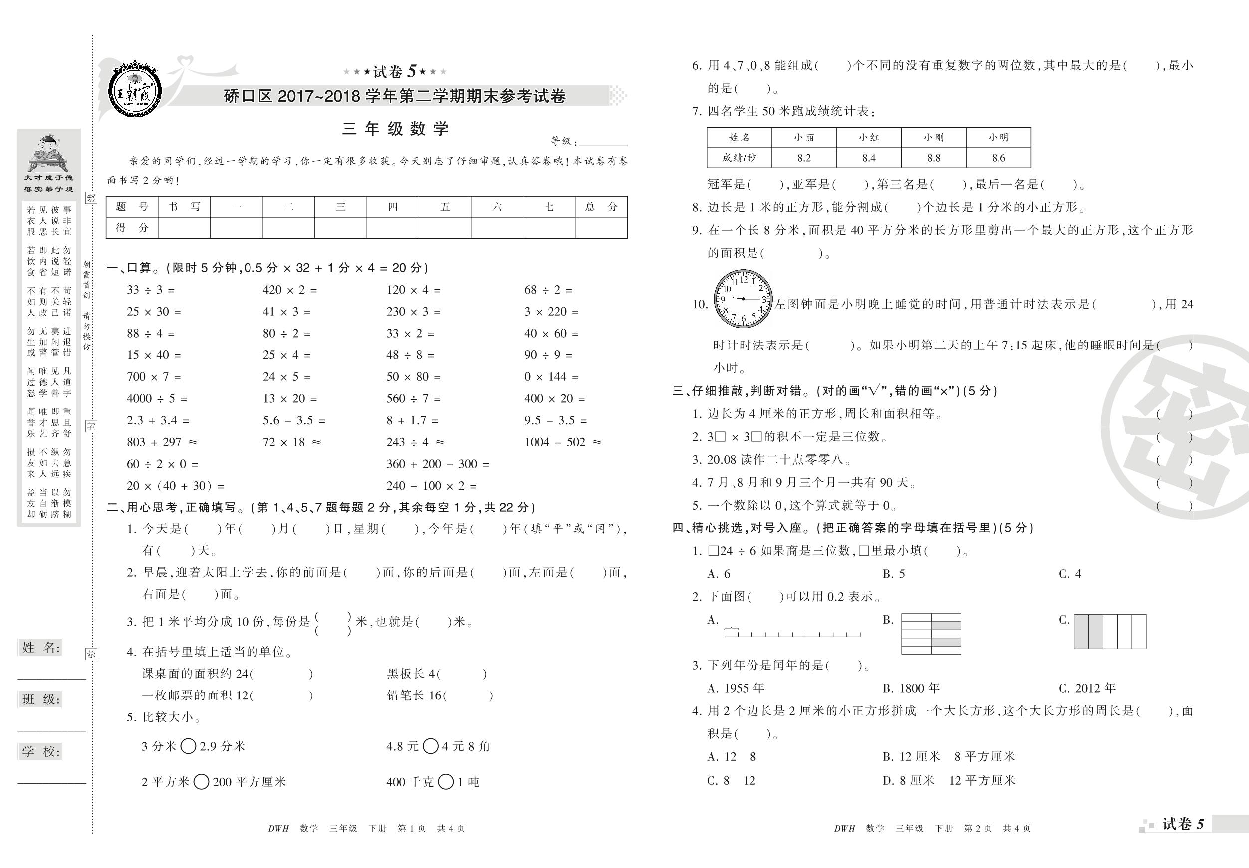 2017-2018学年第二学期武汉市硚口区三年级数学试卷(人教版)【5】