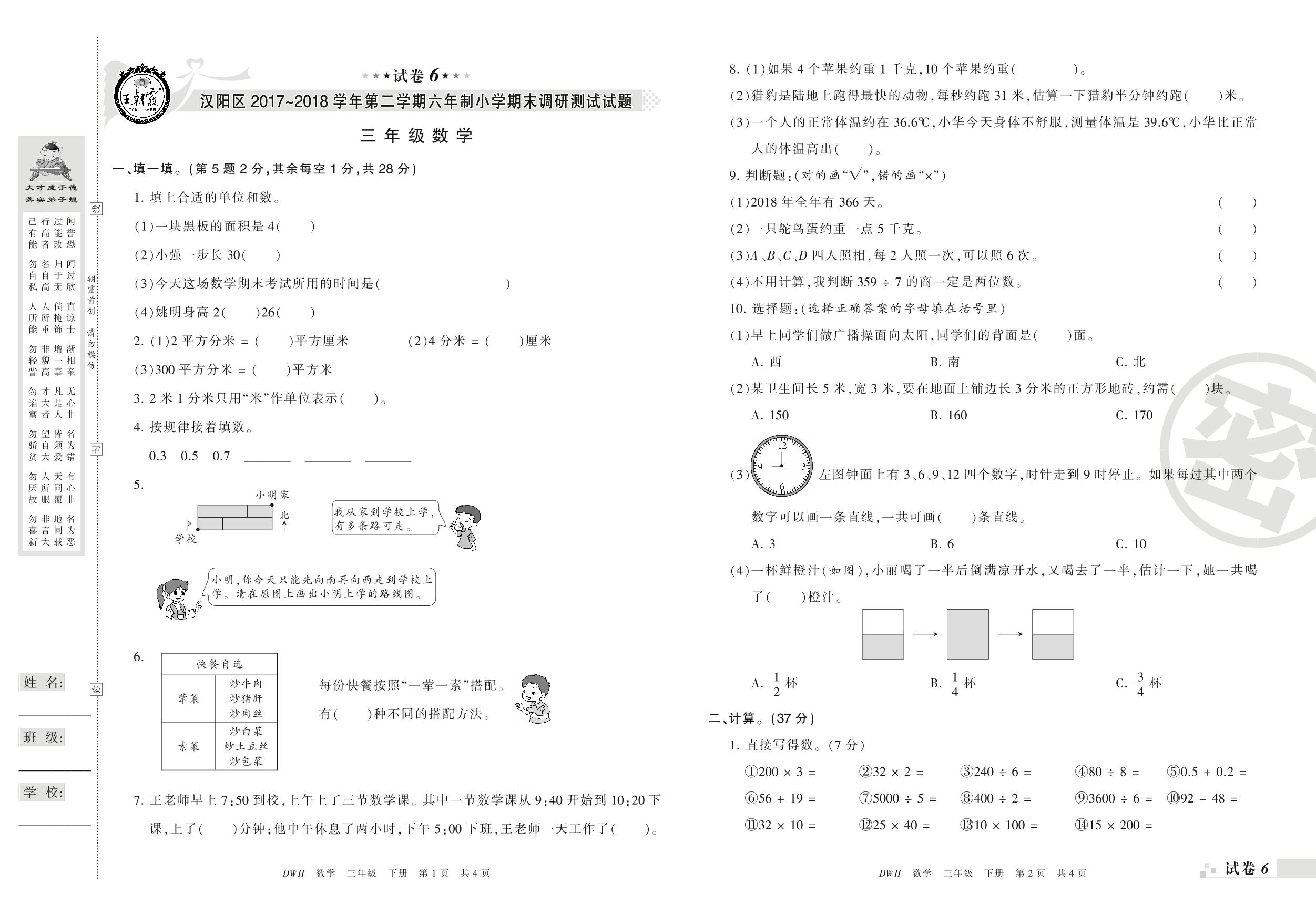 2017-2018学年第二学期武汉市汉阳区三年级数学试卷(人教版)【6】