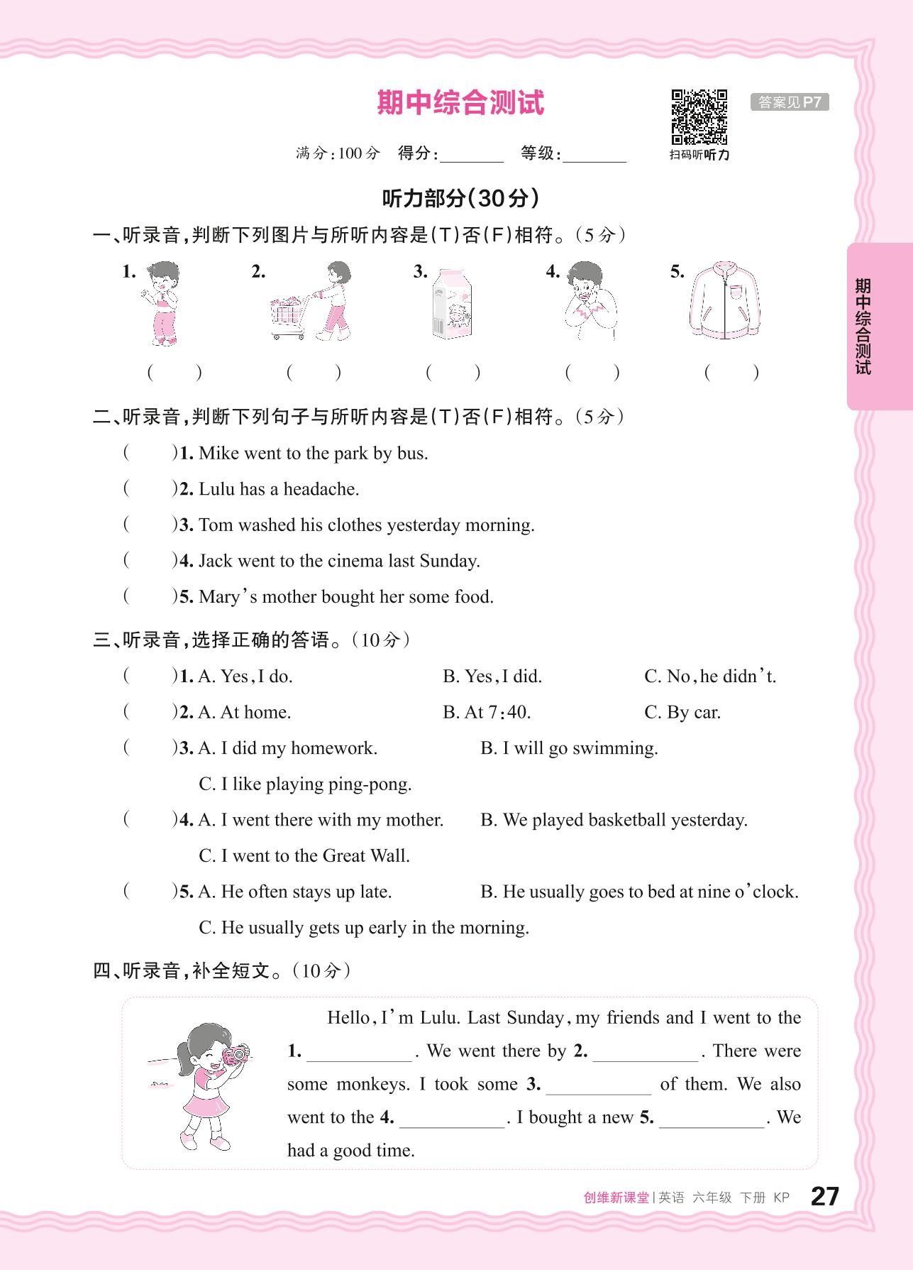 2024春下册六年级英语科普版 期中综合测试