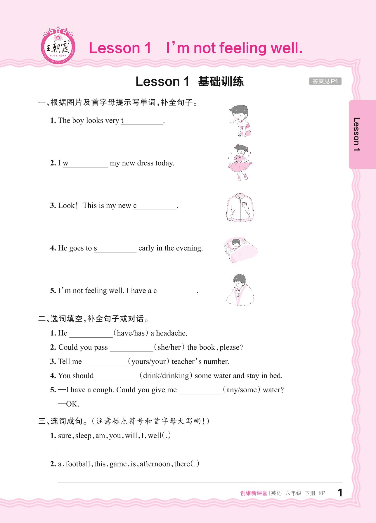 2024春下册六年级英语科普版 Lesson 1 I'm not feeling well.基础训练