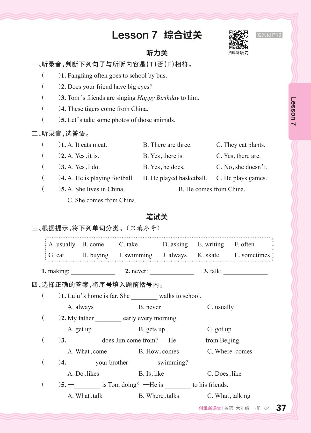2024春下册六年级英语科普版 Lesson 7 Where do the tigers come from?综合过关