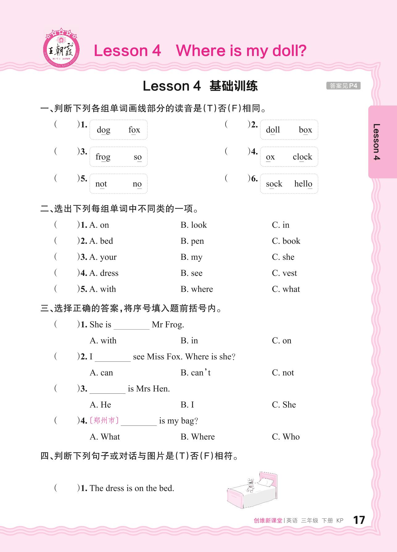 2024春下册三年级英语科普版 Lesson 4 Where is my doll?基础训练