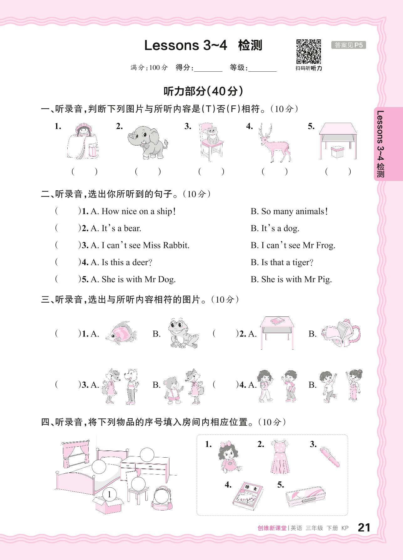 2024春下册三年级英语科普版 Lessons 3~4检测