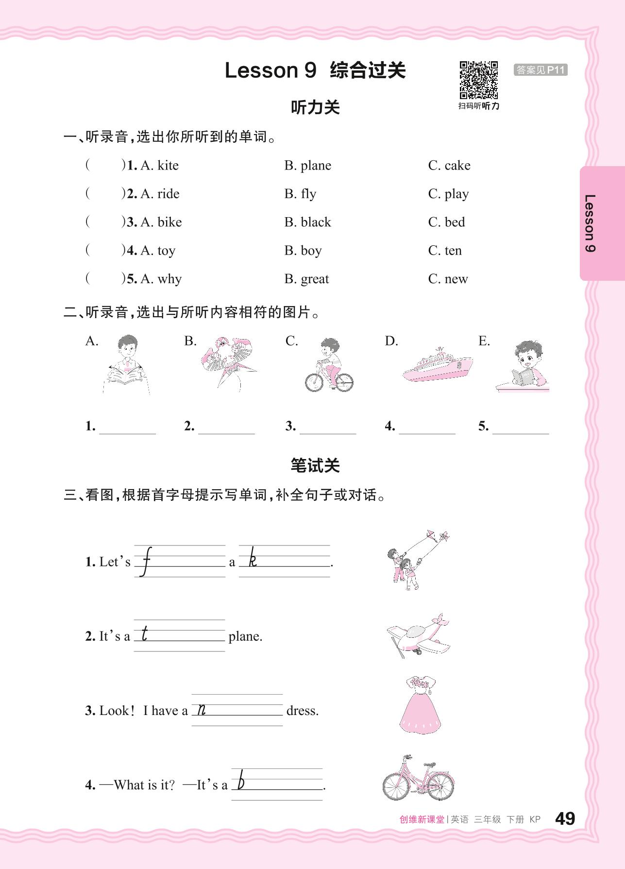 2024春下册三年级英语科普版 Lesson 9 I have a kite.综合过关