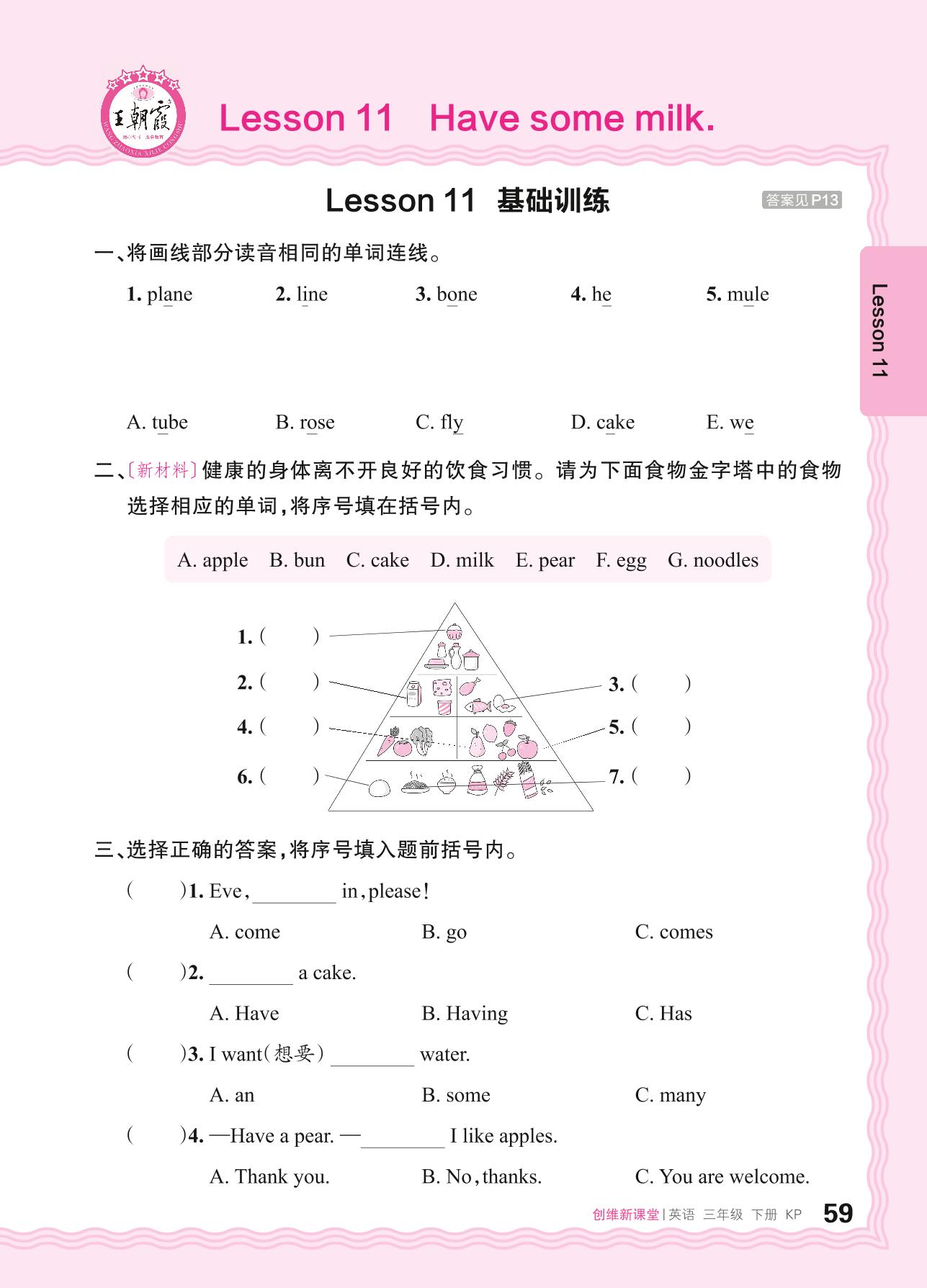 2024春下册三年级英语科普版 Lesson 11 Have some milk.基础训练