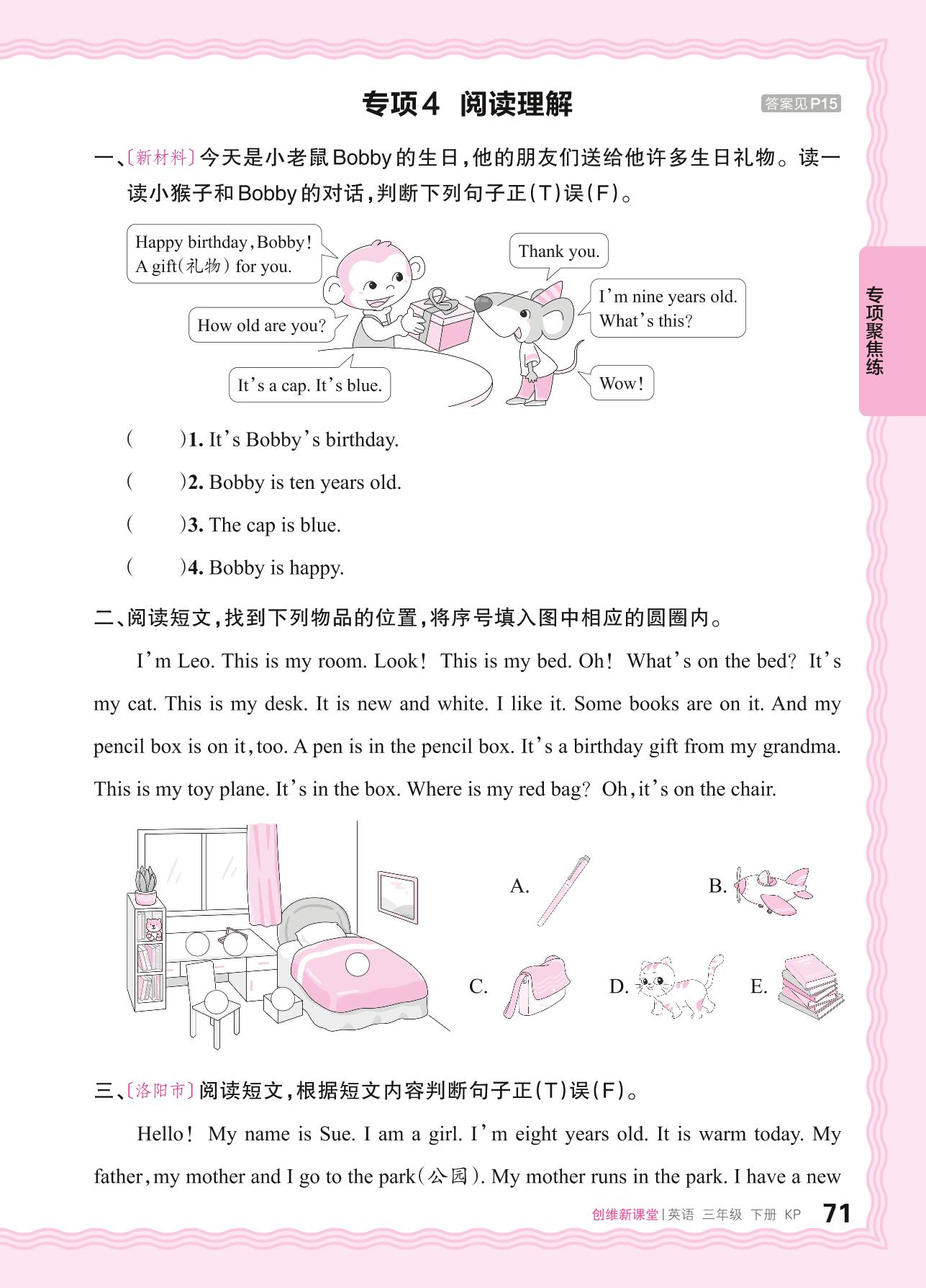 2024春下册三年级英语科普版 期末专项聚焦练——阅读理解【4】