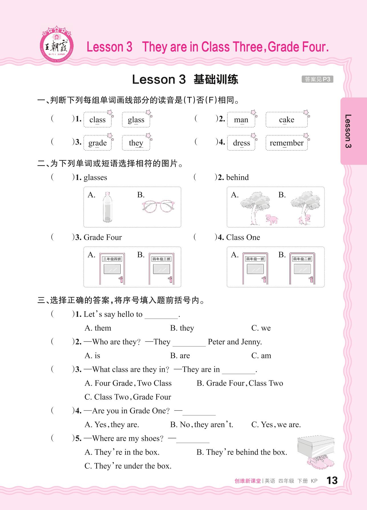 2024春下册四年级英语科普版 Lesson 3 They are in Class Three,Grade Four.基础训练