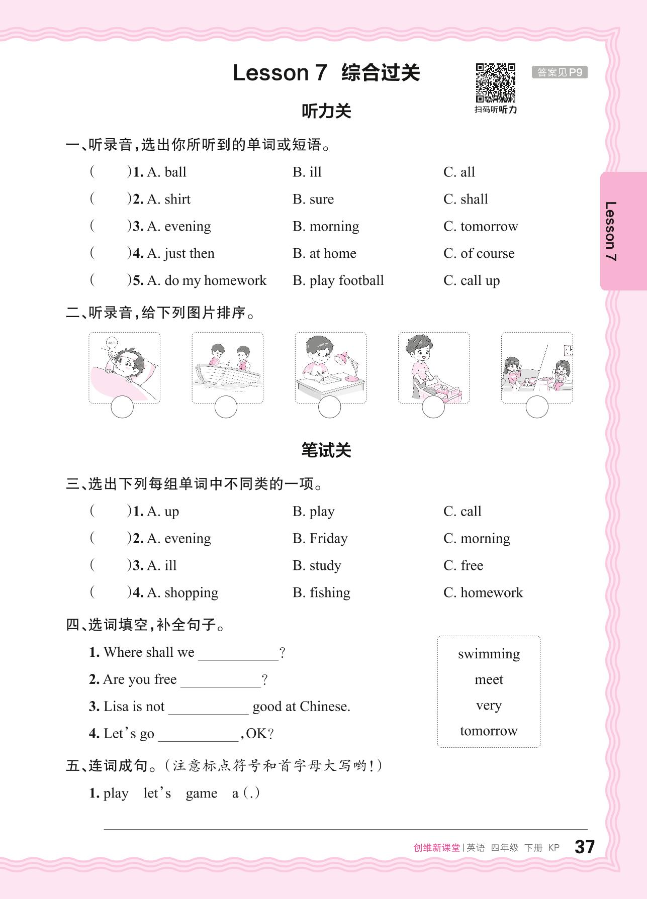 2024春下册四年级英语科普版 Lesson 7 Let's go swimming,OK? 综合过关