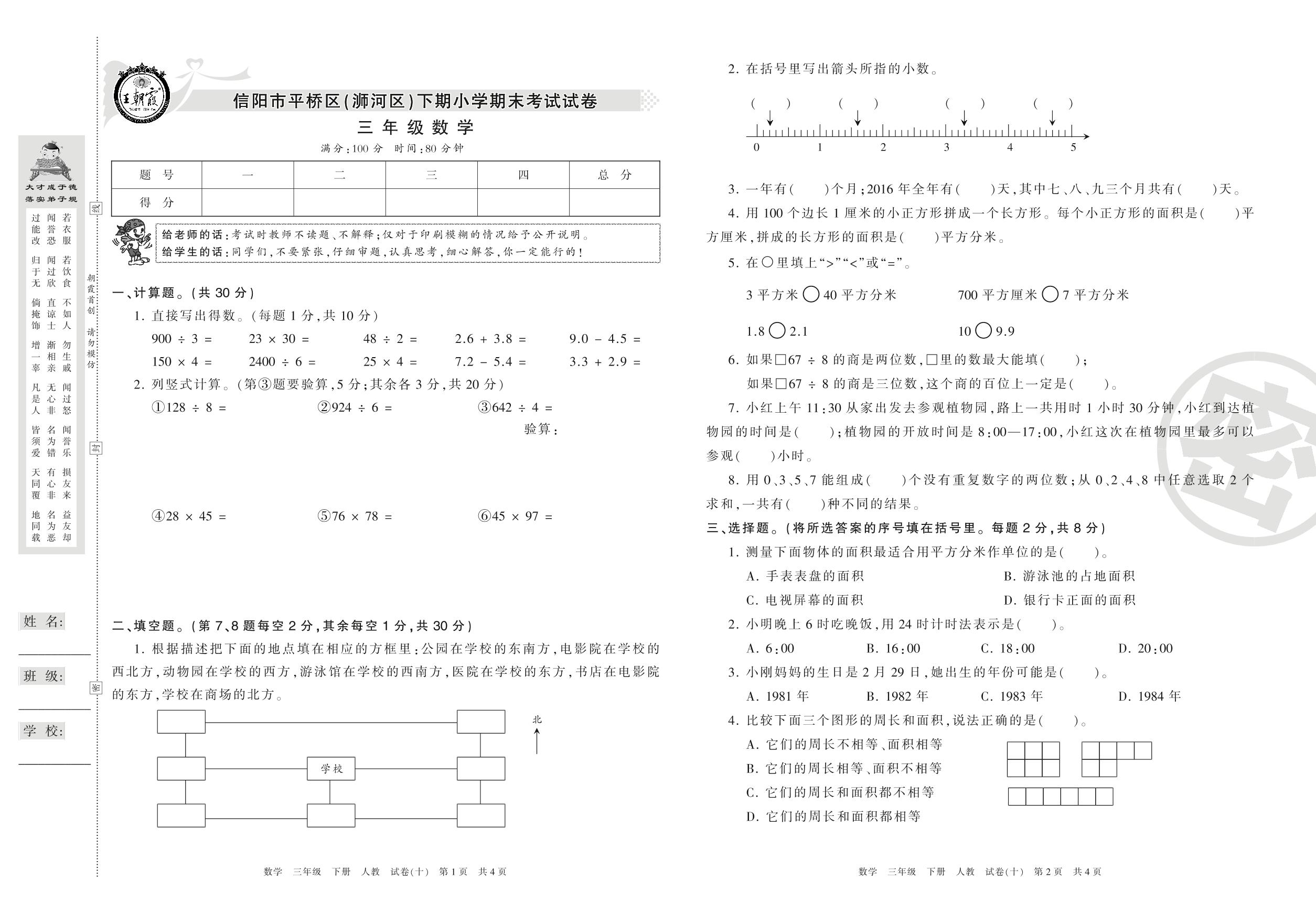 2015-2016学年第二学期信阳市平桥区(浉河区)三年级数学试卷(人教版)【10】