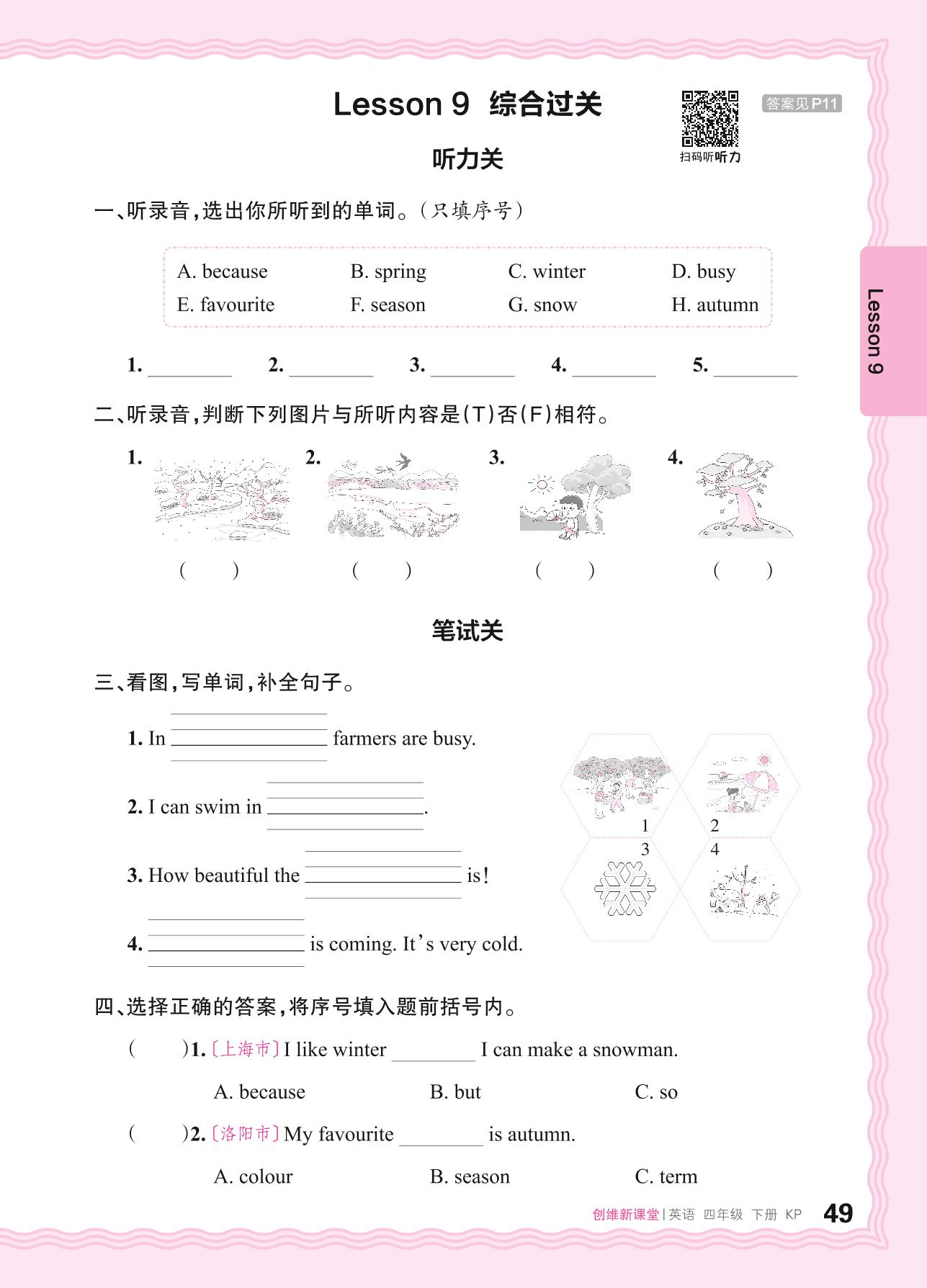 2024春下册四年级英语科普版 Lesson 9 I like summer.综合过关