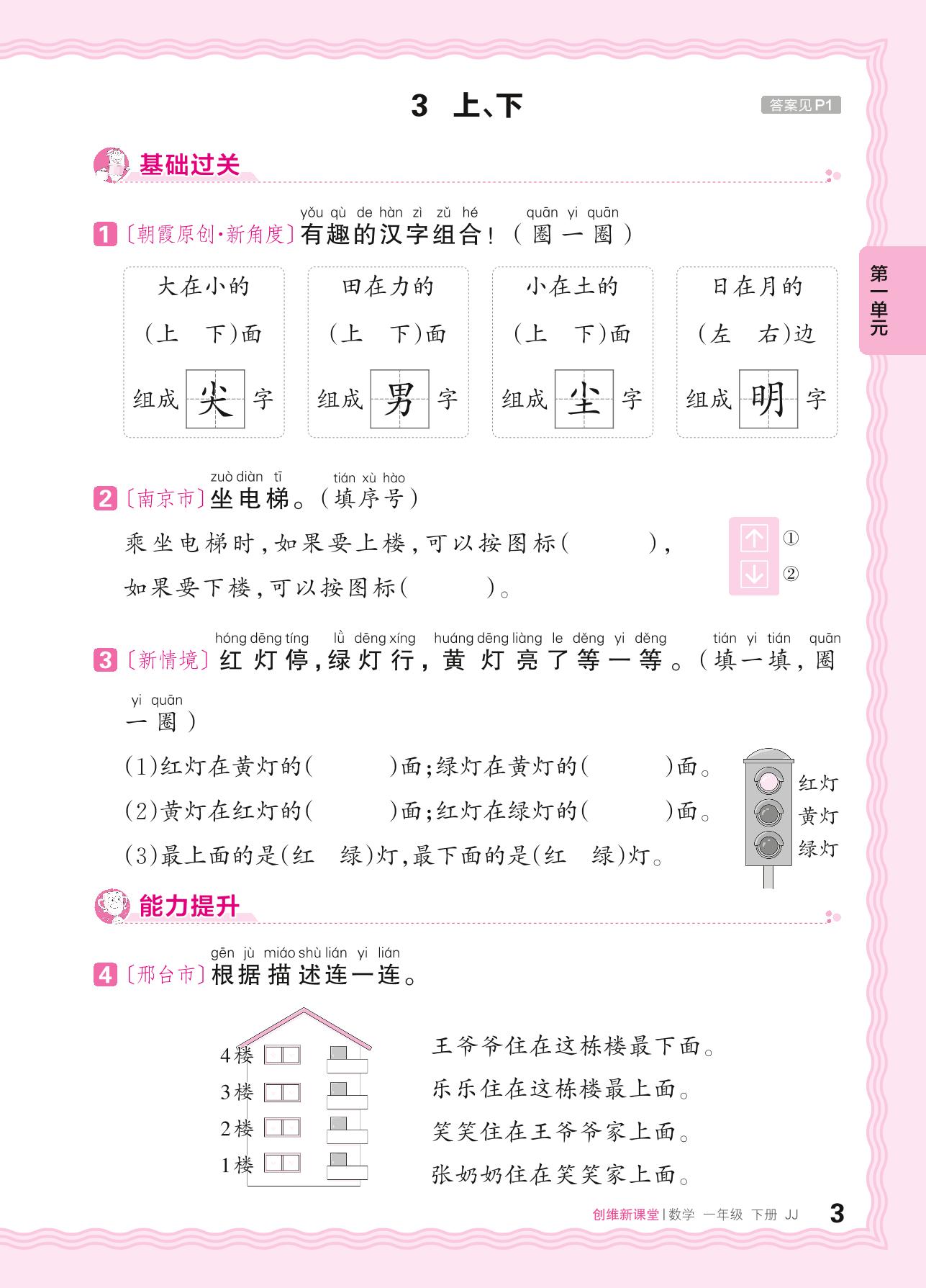 2024春下册一年级数学冀教版 第一单元 位置——3. 上、下