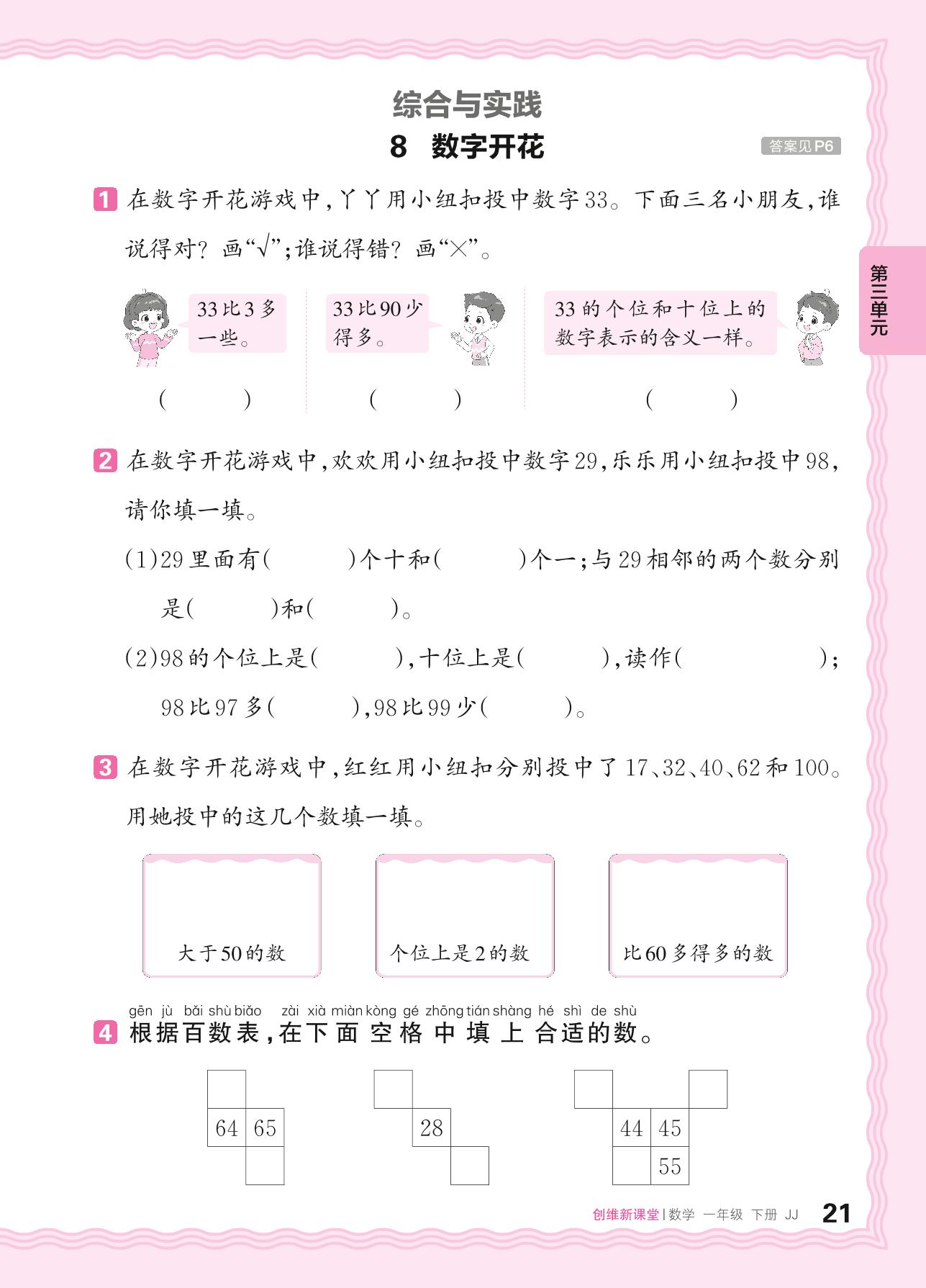 2024春下册一年级数学冀教版 第三单元 100以内数的认识——8. 数字开花