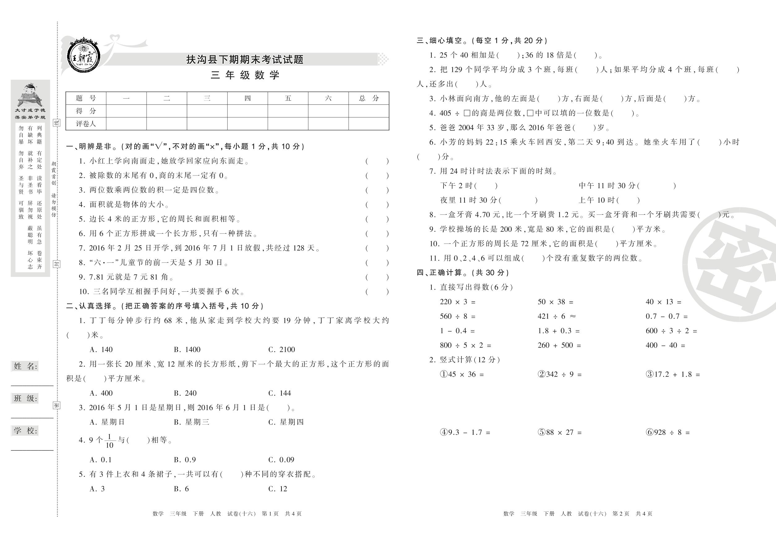 2015-2016学年第二学期周口市扶沟县三年级数学试卷(人教版)【16】