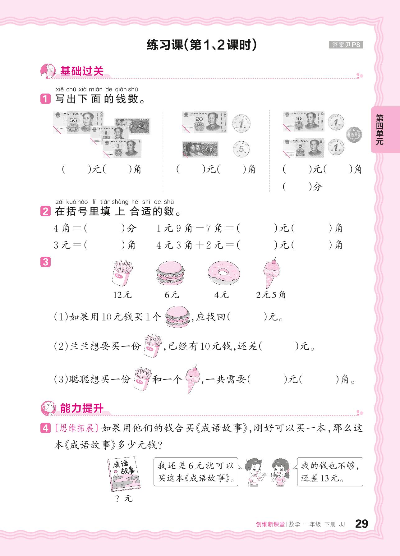 2024春下册一年级数学冀教版 第四单元认识人民币练习课