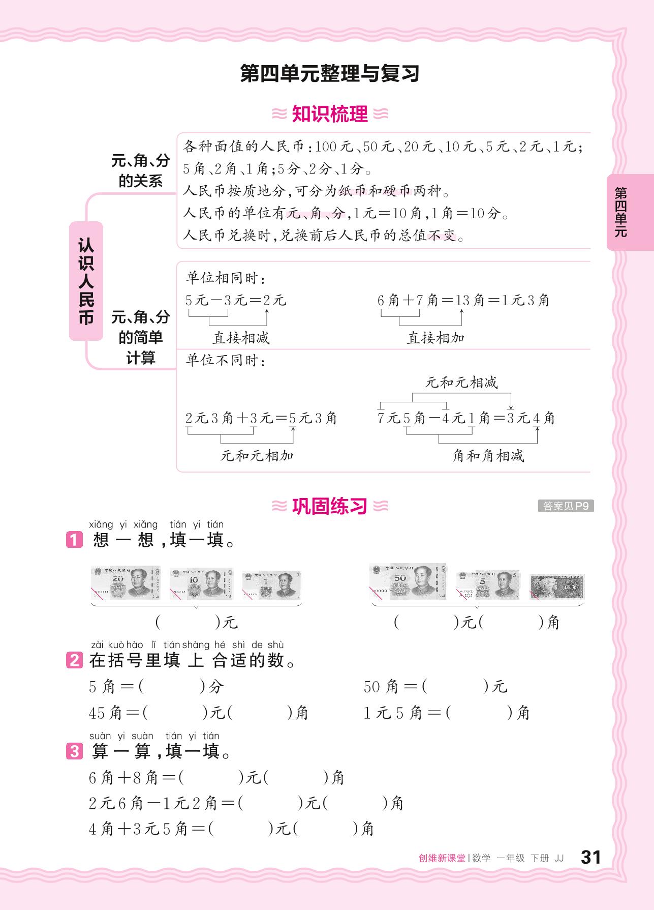 2024春下册一年级数学冀教版 第四单元整理与复习
