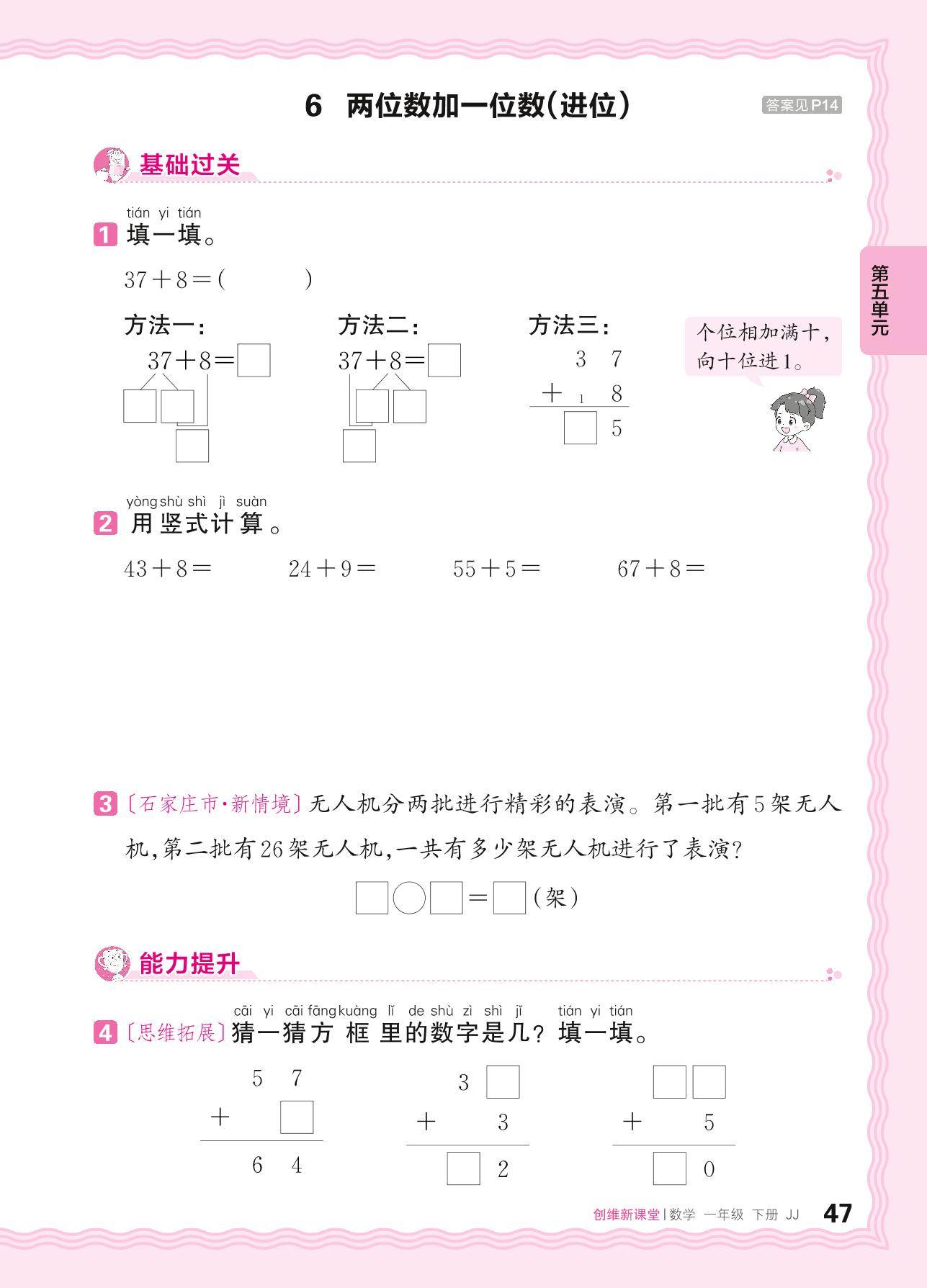 2024春下册一年级数学冀教版 第五单元 100以内的加法和减法(一)——6. 两位数加一位数(进位)