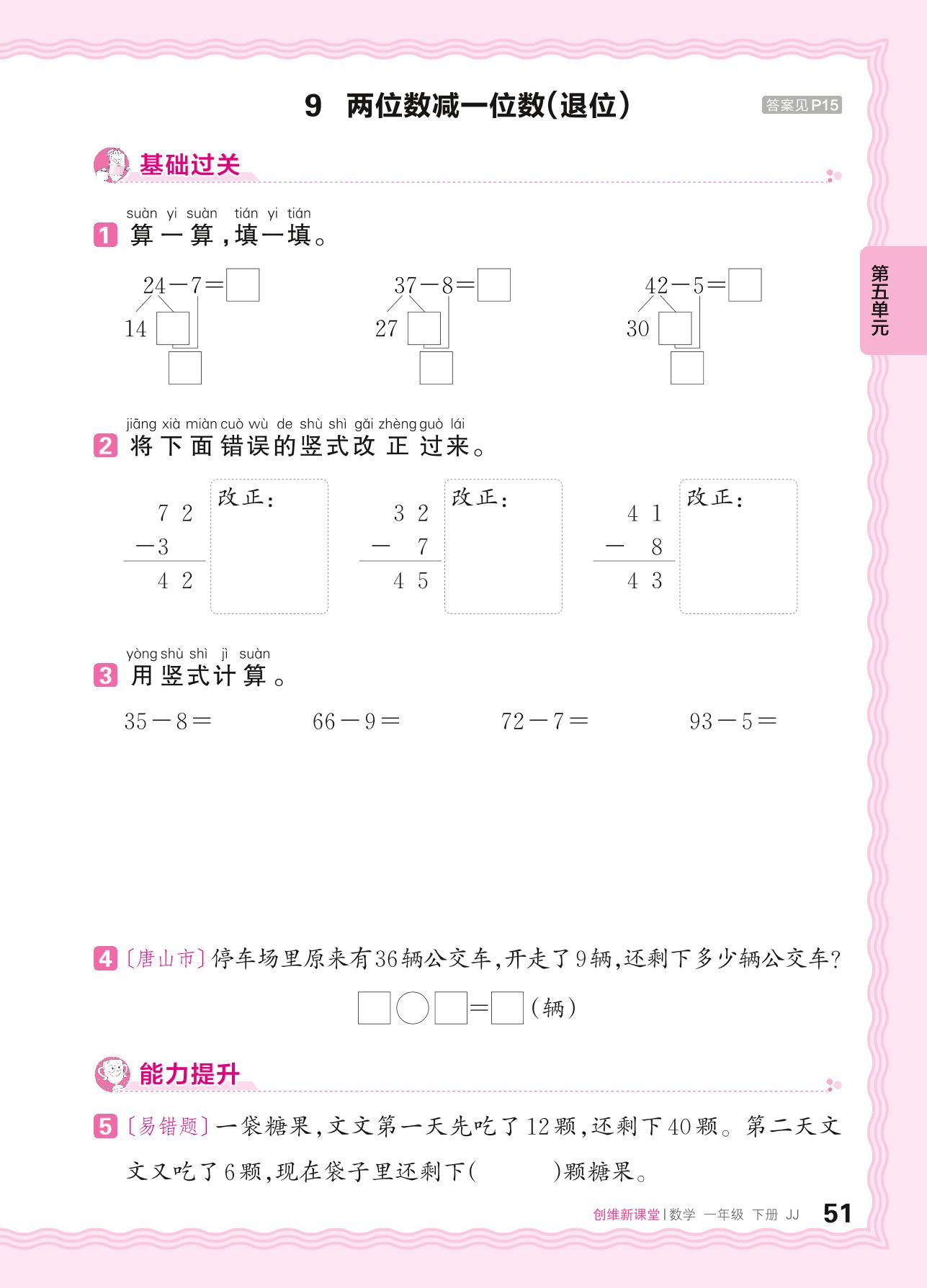 2024春下册一年级数学冀教版 第五单元 100以内的加法和减法(一)——9. 两位数减一位数(退位)