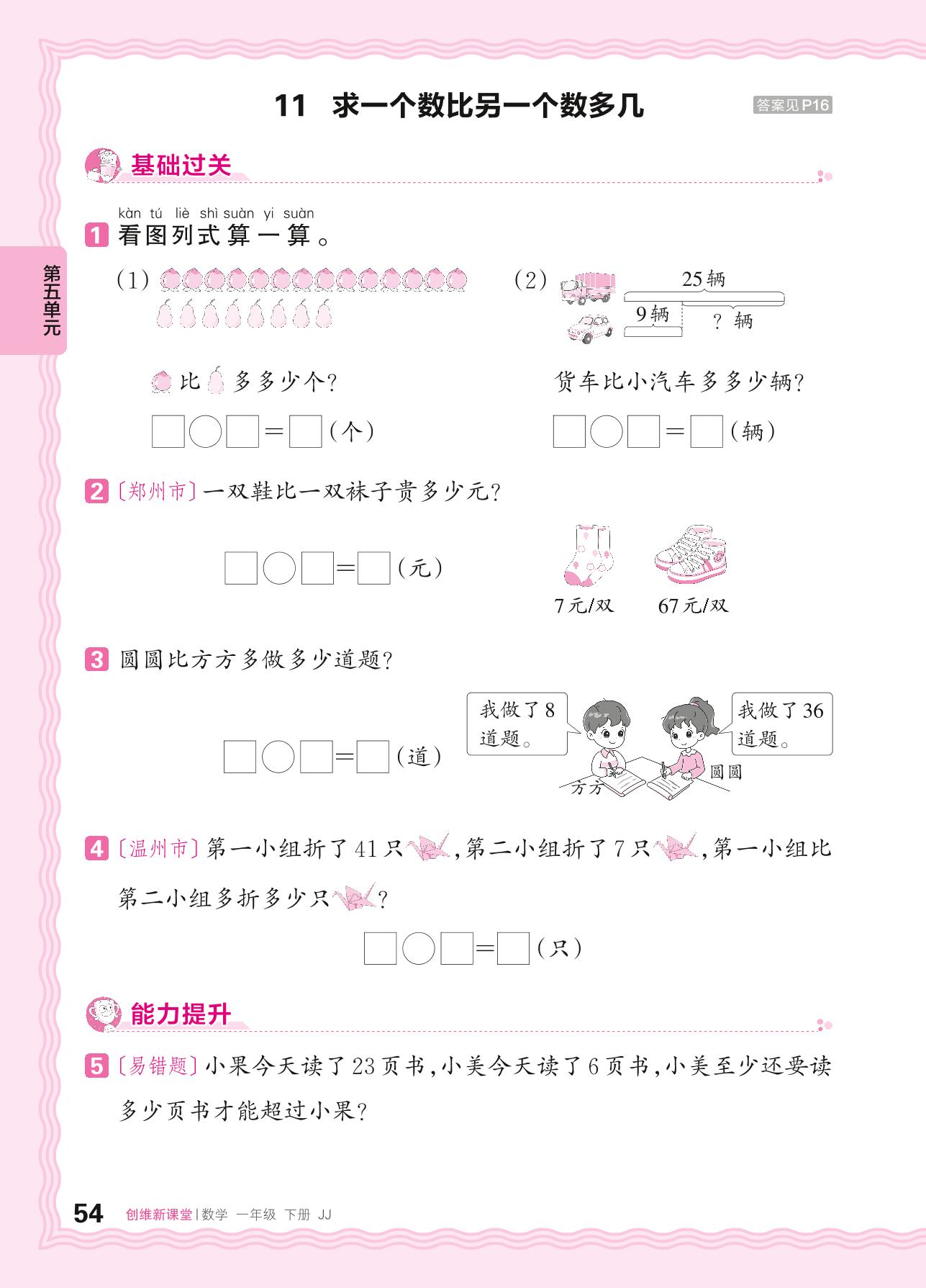 2024春下册一年级数学冀教版 第五单元 100以内的加法和减法(一)——11. 求一个数比另一个数多几