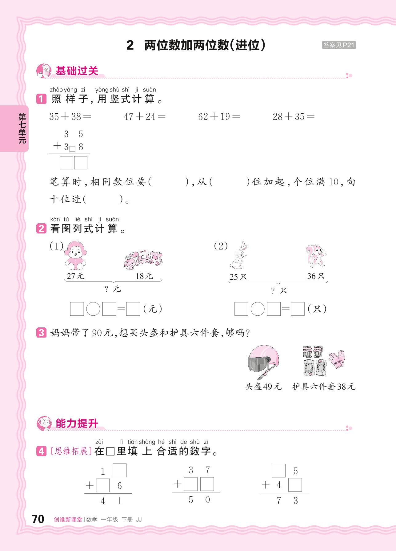 2024春下册一年级数学冀教版 第七单元 100以内的加法和减法(二)——2. 两位数加两位数(进位)