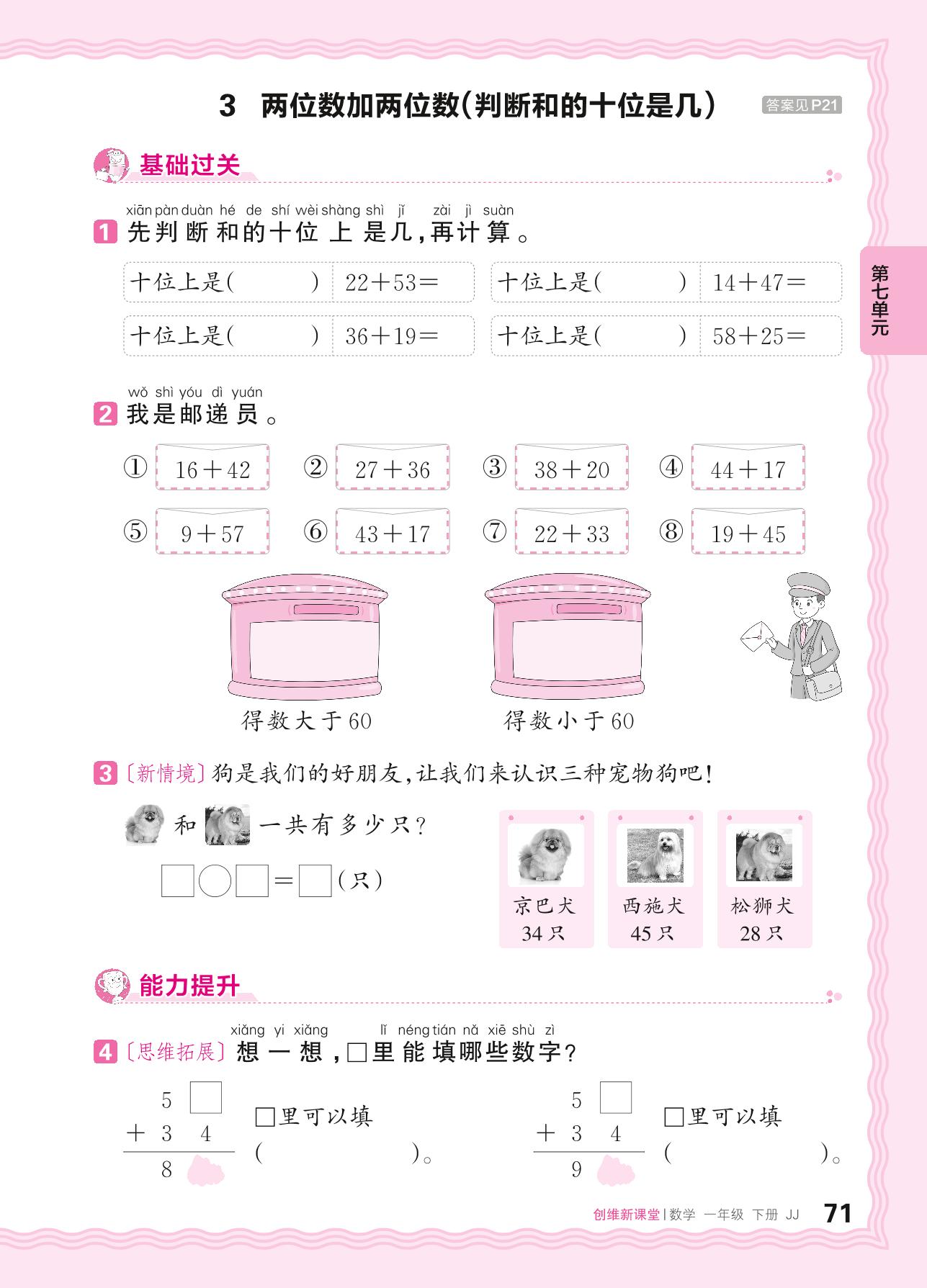 2024春下册一年级数学冀教版 第七单元 100以内的加法和减法(二)——3. 两位数加两位数(判断和的十位是几)