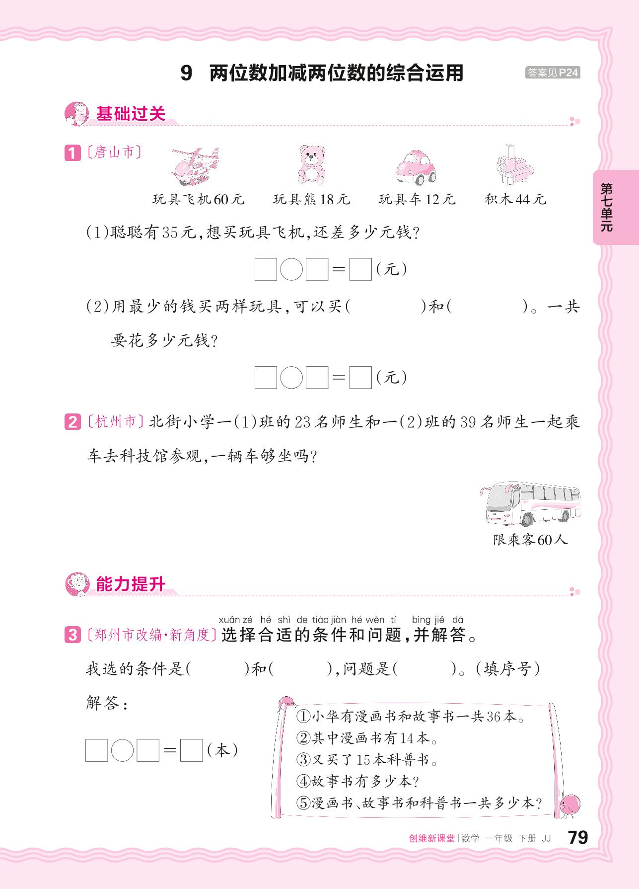 2024春下册一年级数学冀教版 第七单元 100以内的加法和减法(二)——9. 两位数加减两位数的综合运用