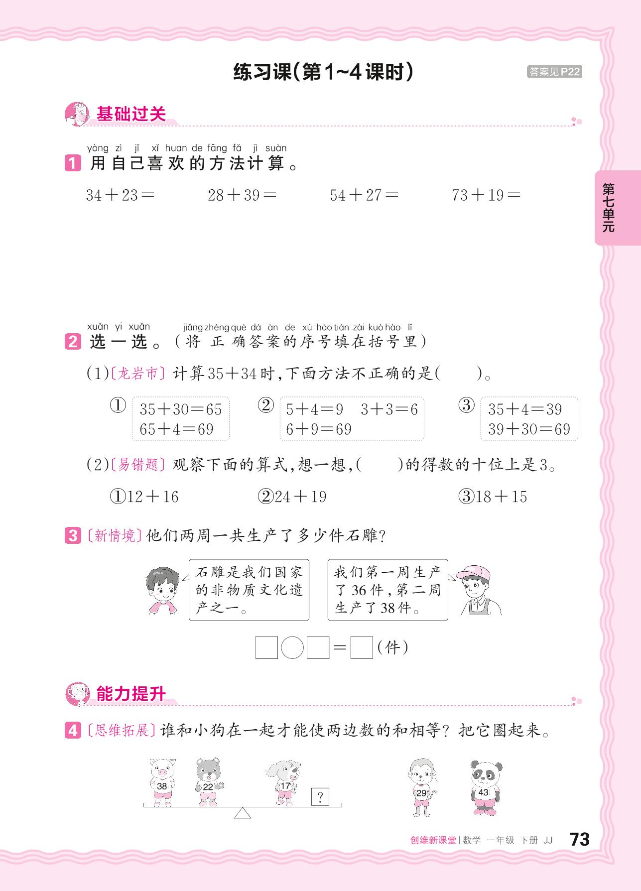 2024春下册一年级数学冀教版 第七单元 100以内的加法和减法(二)——两位数加两位数(不进位)、两位数加两位数(进位)、两位数加两位数(判断和的十位是几)、两位数加两位数(口算)练习课