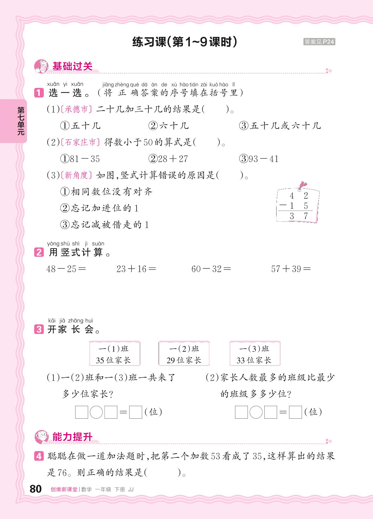 2024春下册一年级数学冀教版 第七单元100以内的加法和减法(二)练习课