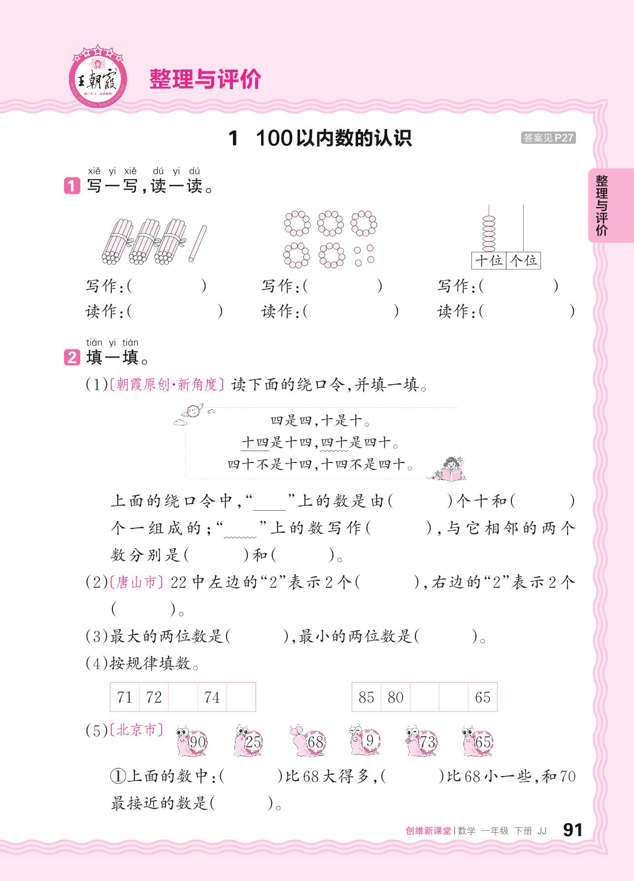 2024春下册一年级数学冀教版 整理与评价——1. 100 以内数的认识