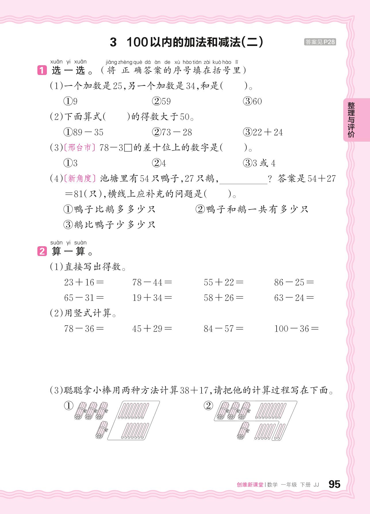 2024春下册一年级数学冀教版 整理与评价——3. 100以内的加法和减法(二)