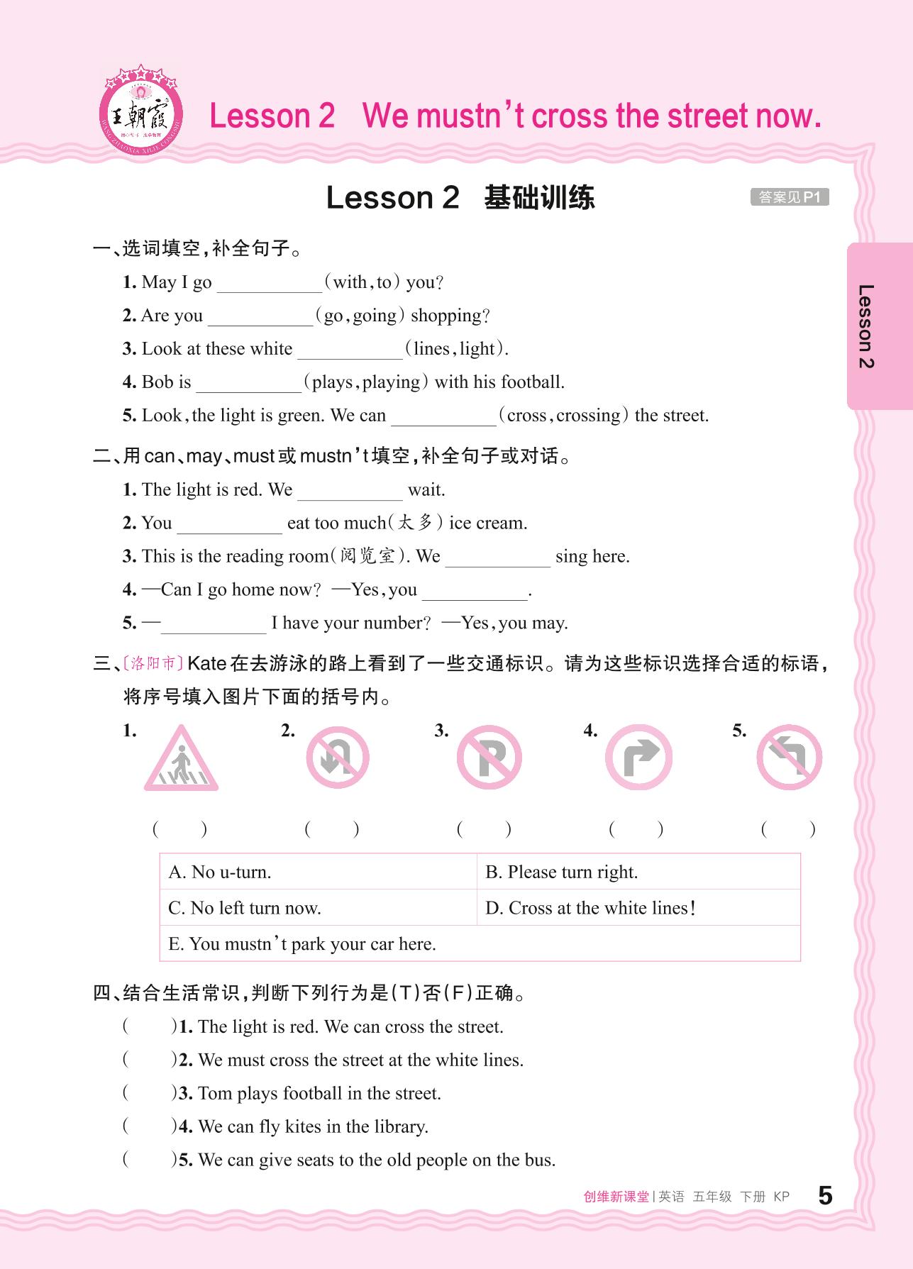 2024春下册五年级英语科普版 Lesson 2 We mustn't cross the street now.基础训练