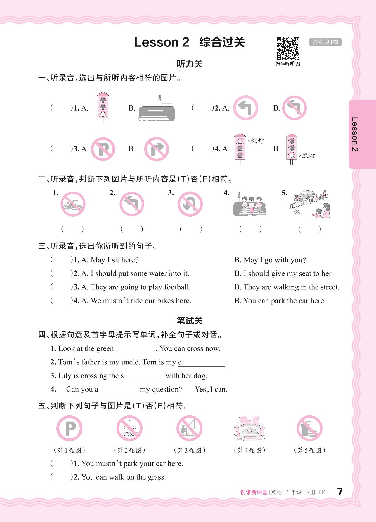 2024春下册五年级英语科普版 Lesson 2 We mustn't cross the street now.综合过关