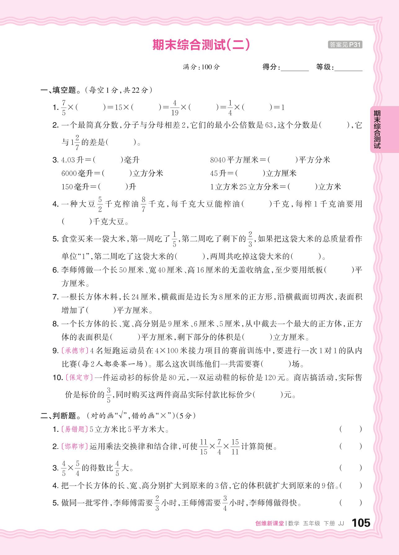 2024春下册五年级数学冀教版 期末综合测试(二)