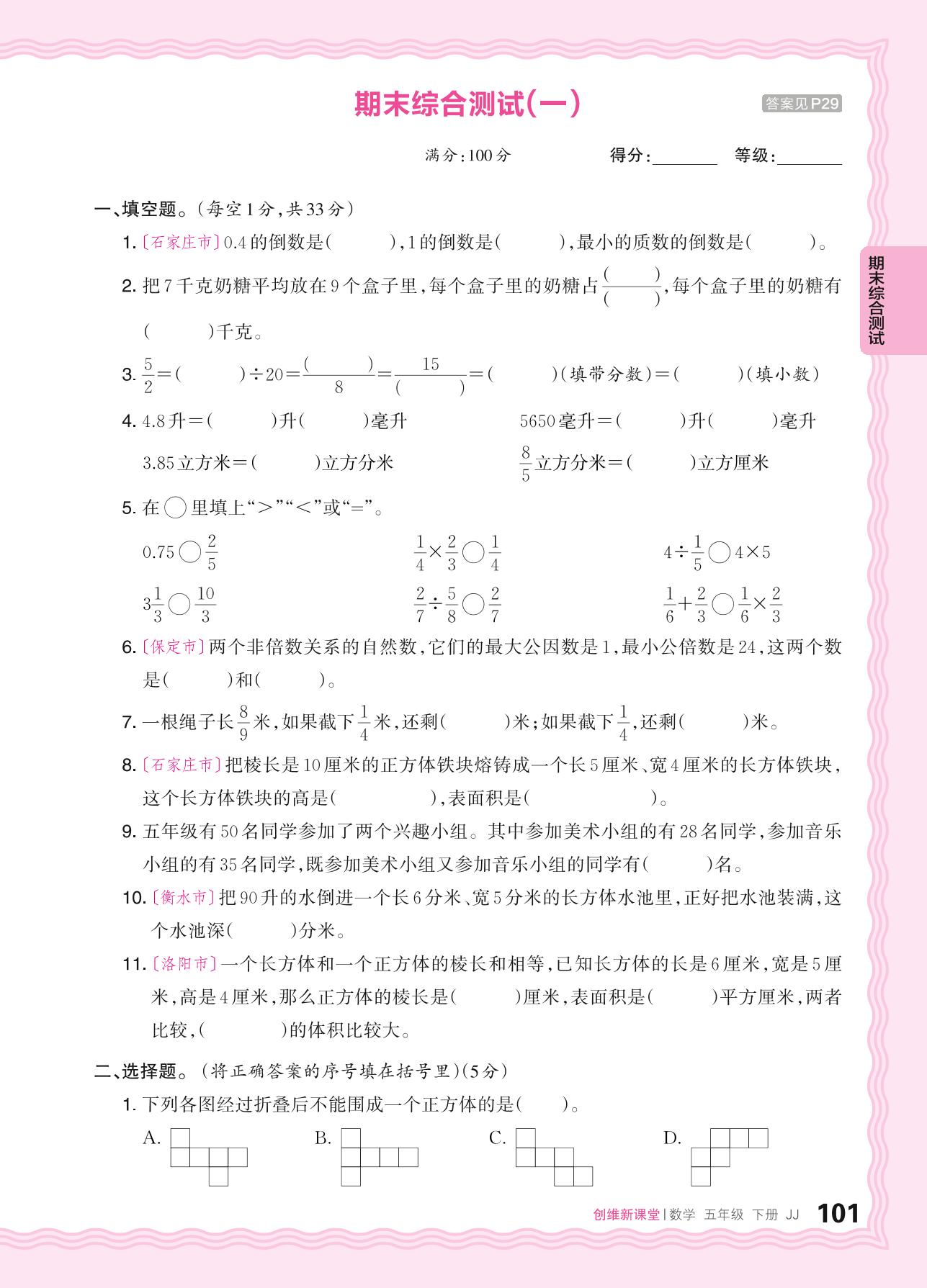 2024春下册五年级数学冀教版 期末综合测试(一)