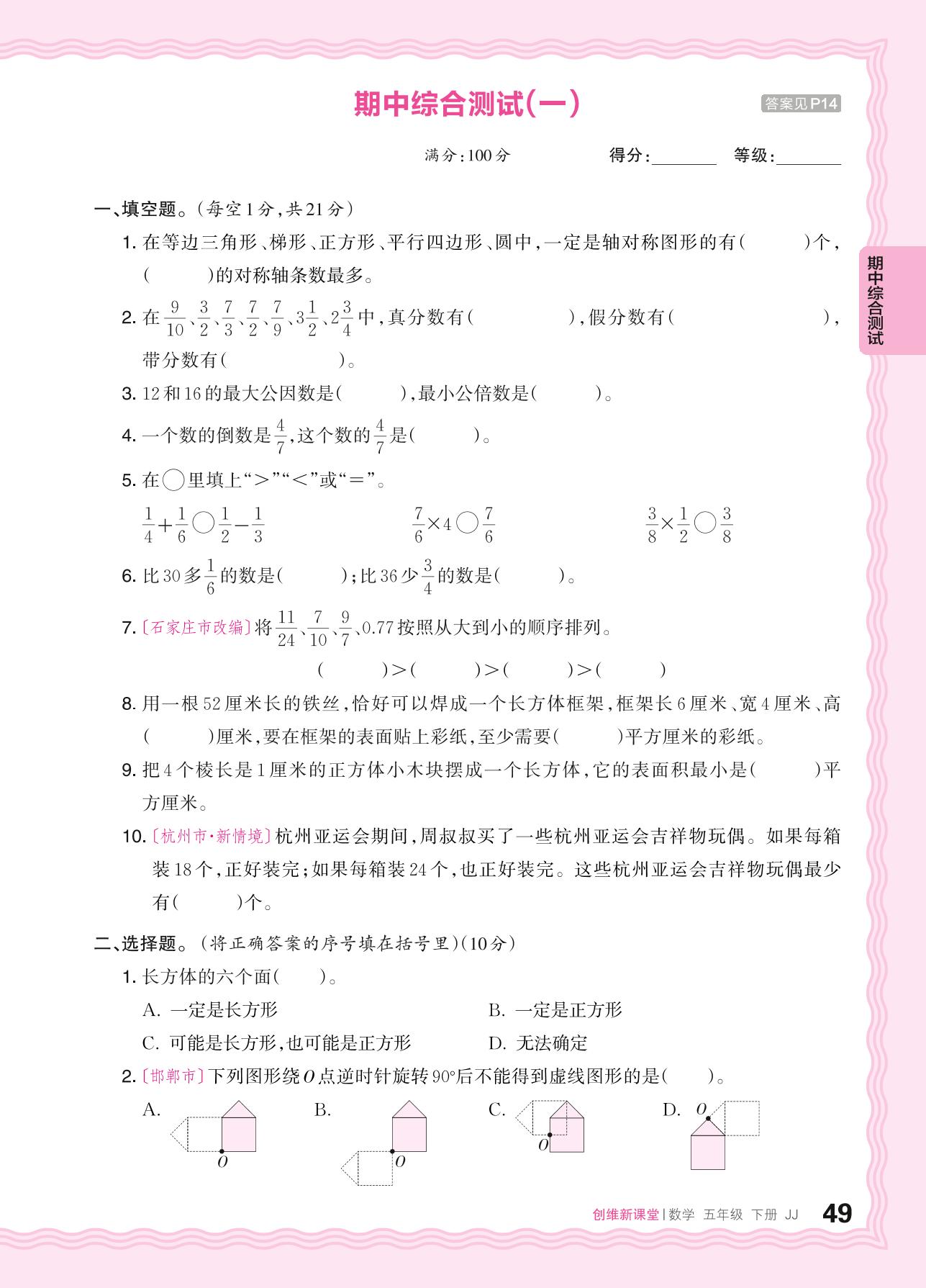 2024春下册五年级数学冀教版 期中综合测试(一)