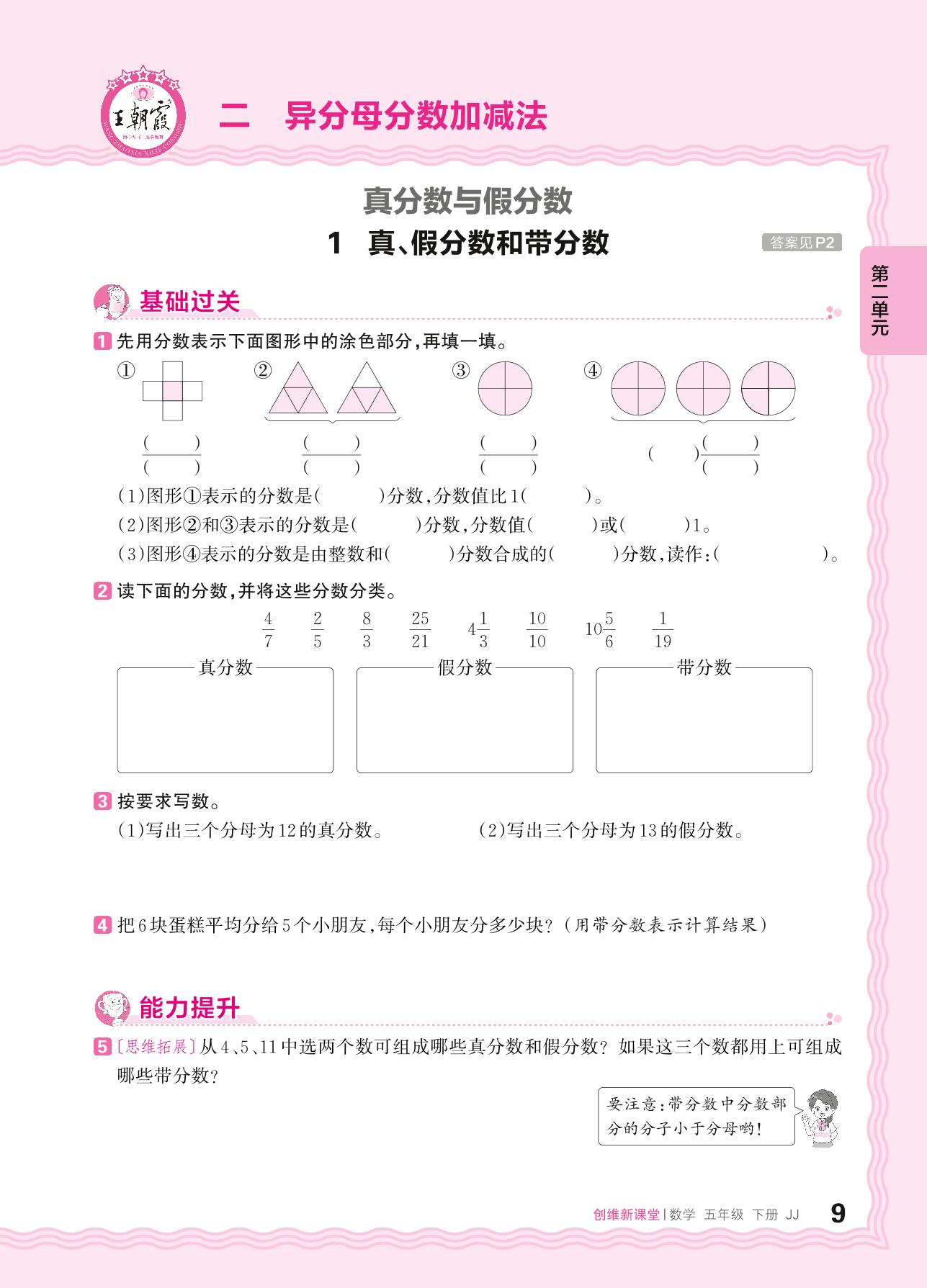 2024春下册五年级数学冀教版 第二单元 异分母分数加减法——1. 真、假分数和带分数