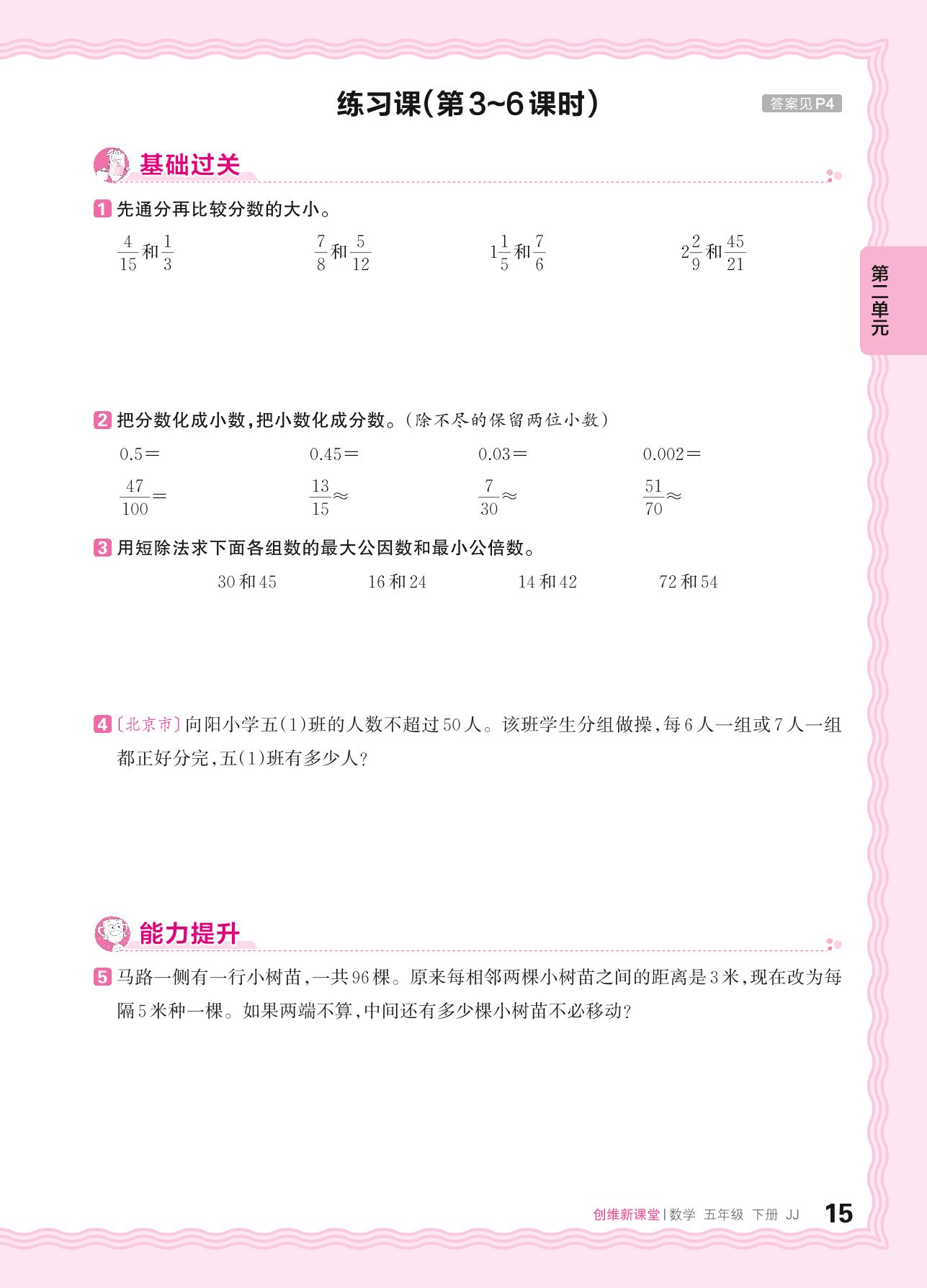 2024春下册五年级数学冀教版 第二单元 异分母分数加减法——异分母分数的大小比较、公倍数与最小公倍数、求两个数的最小公倍数、分数和小数互化练习课
