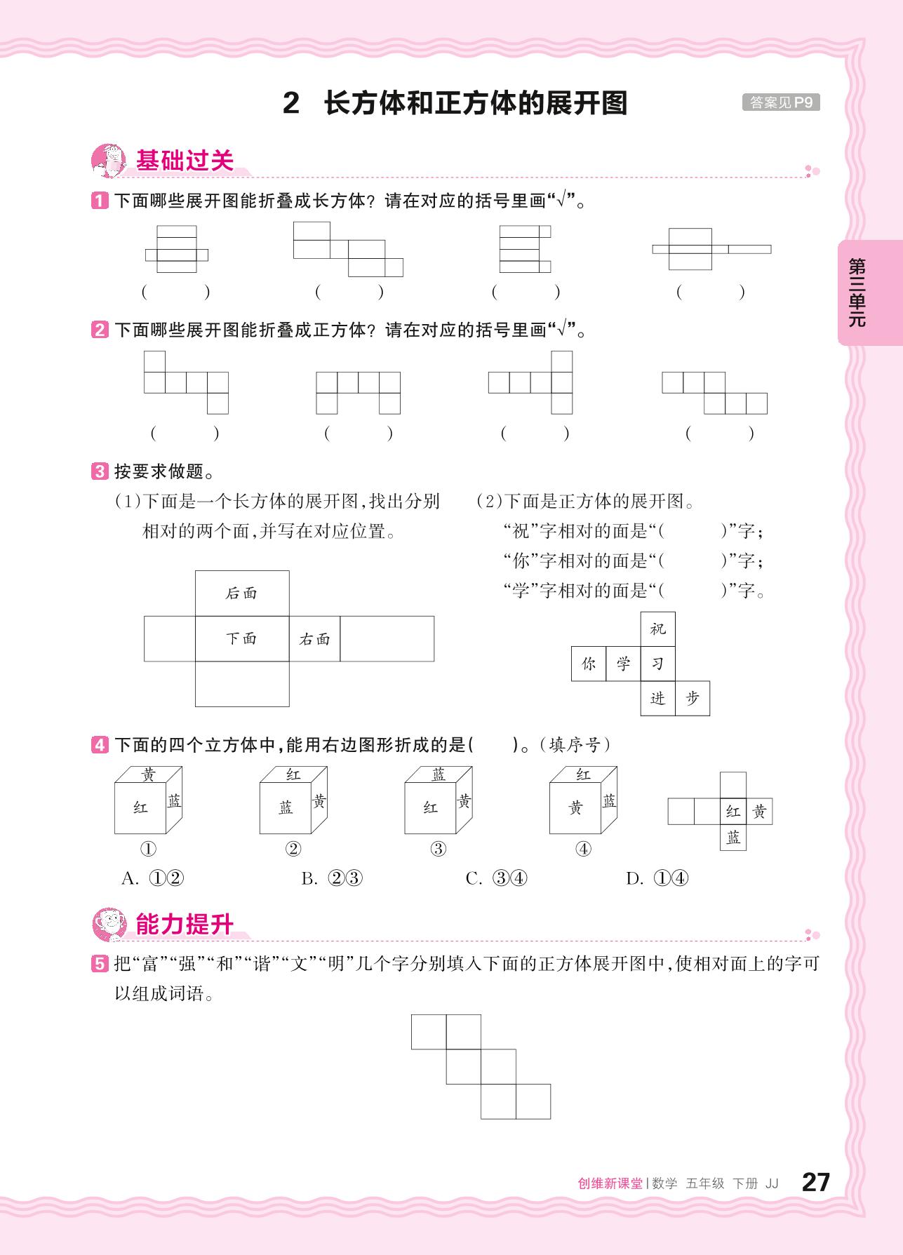 2024春下册五年级数学冀教版 第三单元 长方体和正方体——2. 长方体和正方体的展开图