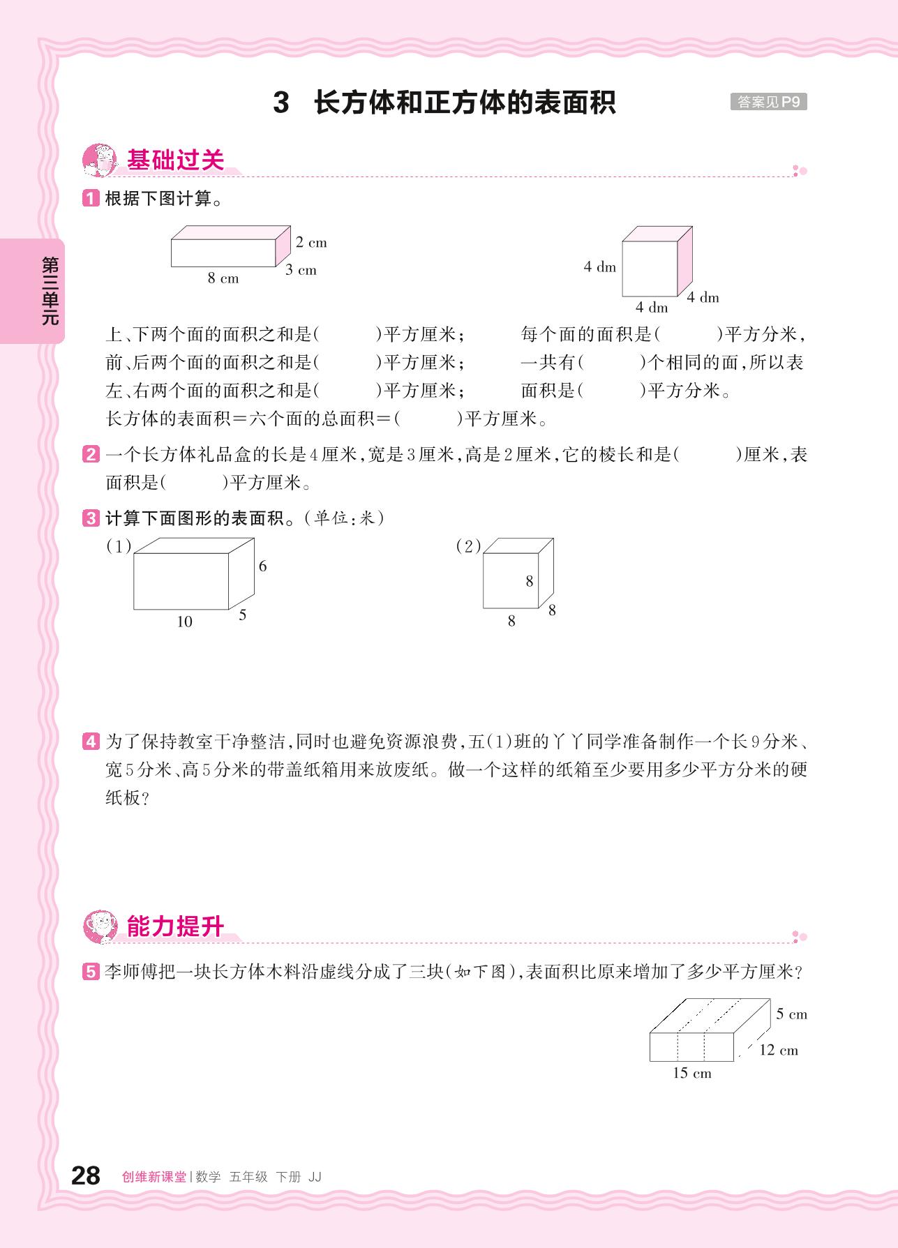 2024春下册五年级数学冀教版 第三单元 长方体和正方体——3. 长方体和正方体的表面积