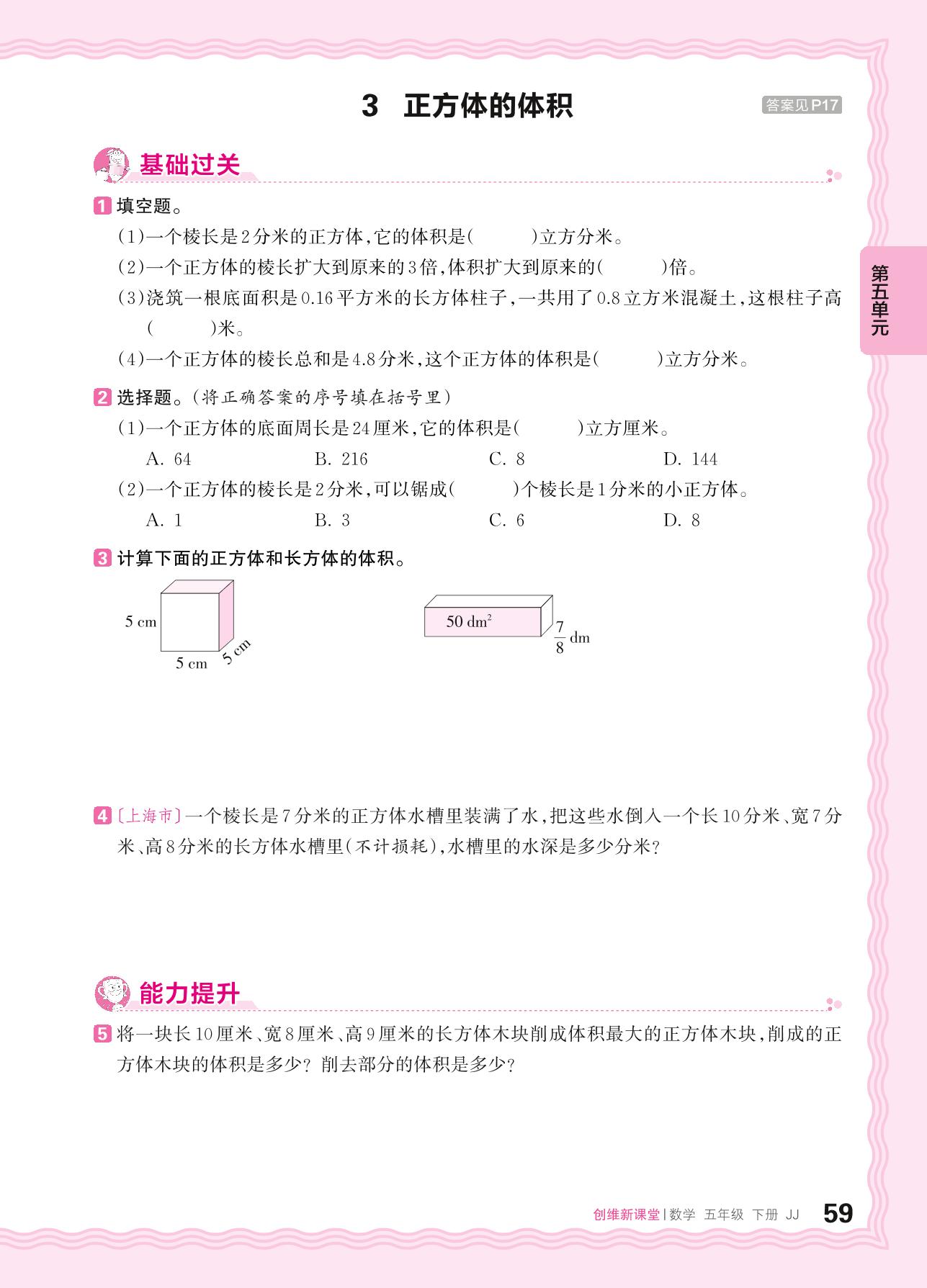 2024春下册五年级数学冀教版 第五单元 长方体和正方体的体积——3. 正方体的体积
