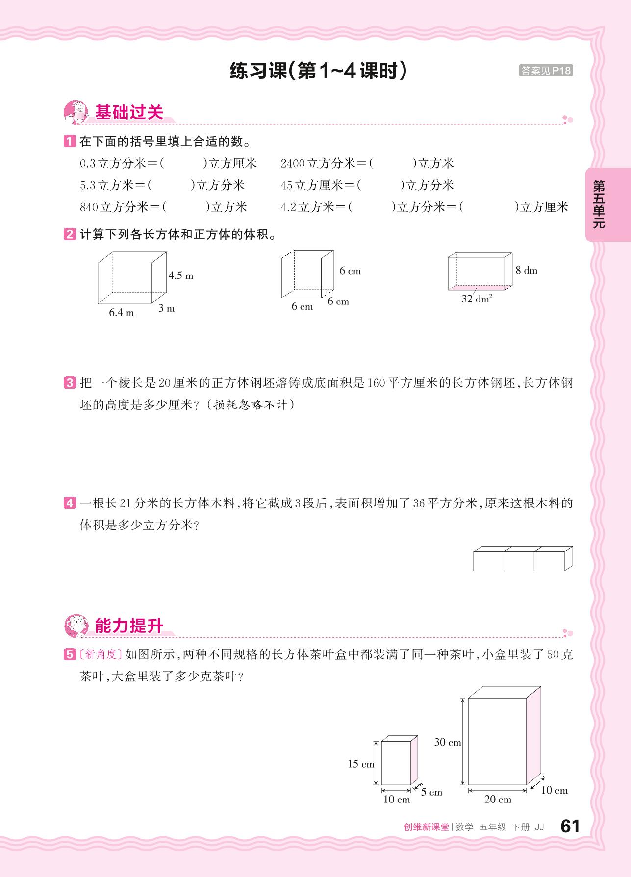 2024春下册五年级数学冀教版 第五单元 长方体和正方体的体积——体积和体积单位、长方体的体积、正方体的体积、体积单位之间的进率练习课