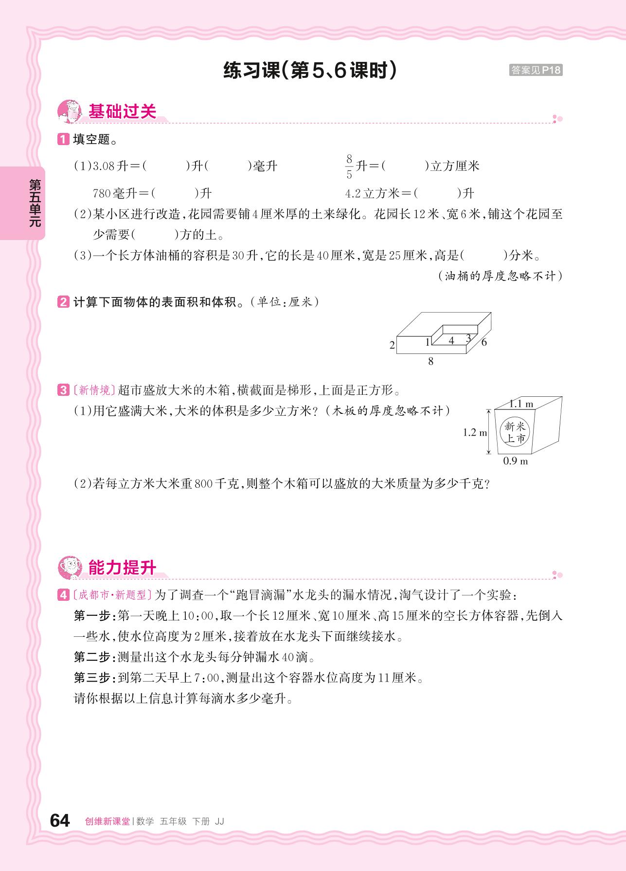 2024春下册五年级数学冀教版 第五单元 长方体和正方体的体积——土石方问题、容积问题练习课