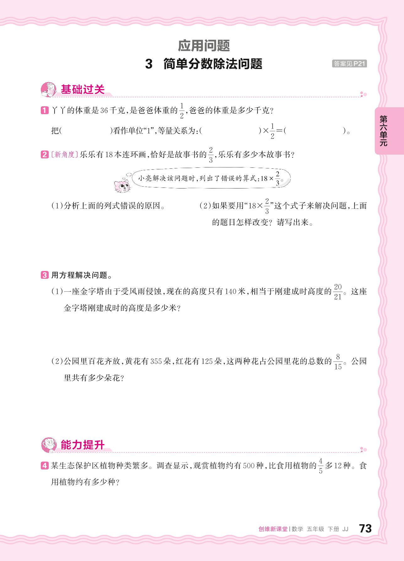 2024春下册五年级数学冀教版 第六单元 分数除法——3. 简单分数除法问题