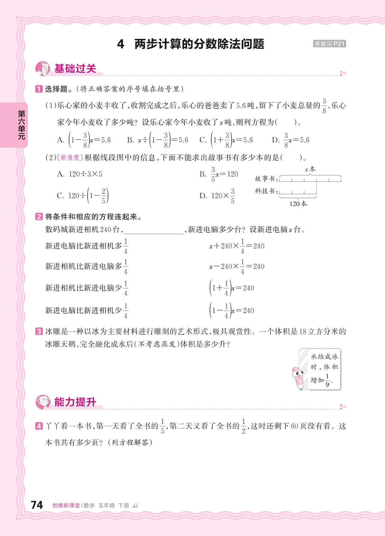 2024春下册五年级数学冀教版 第六单元 分数除法——4. 两步计算的分数除法问题