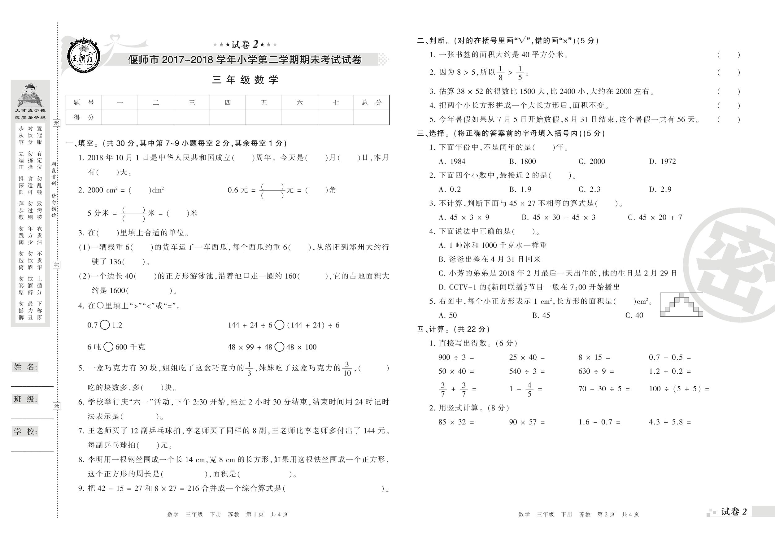 2017-2018学年第二学期偃师市三年级数学试卷(苏教版)【2】