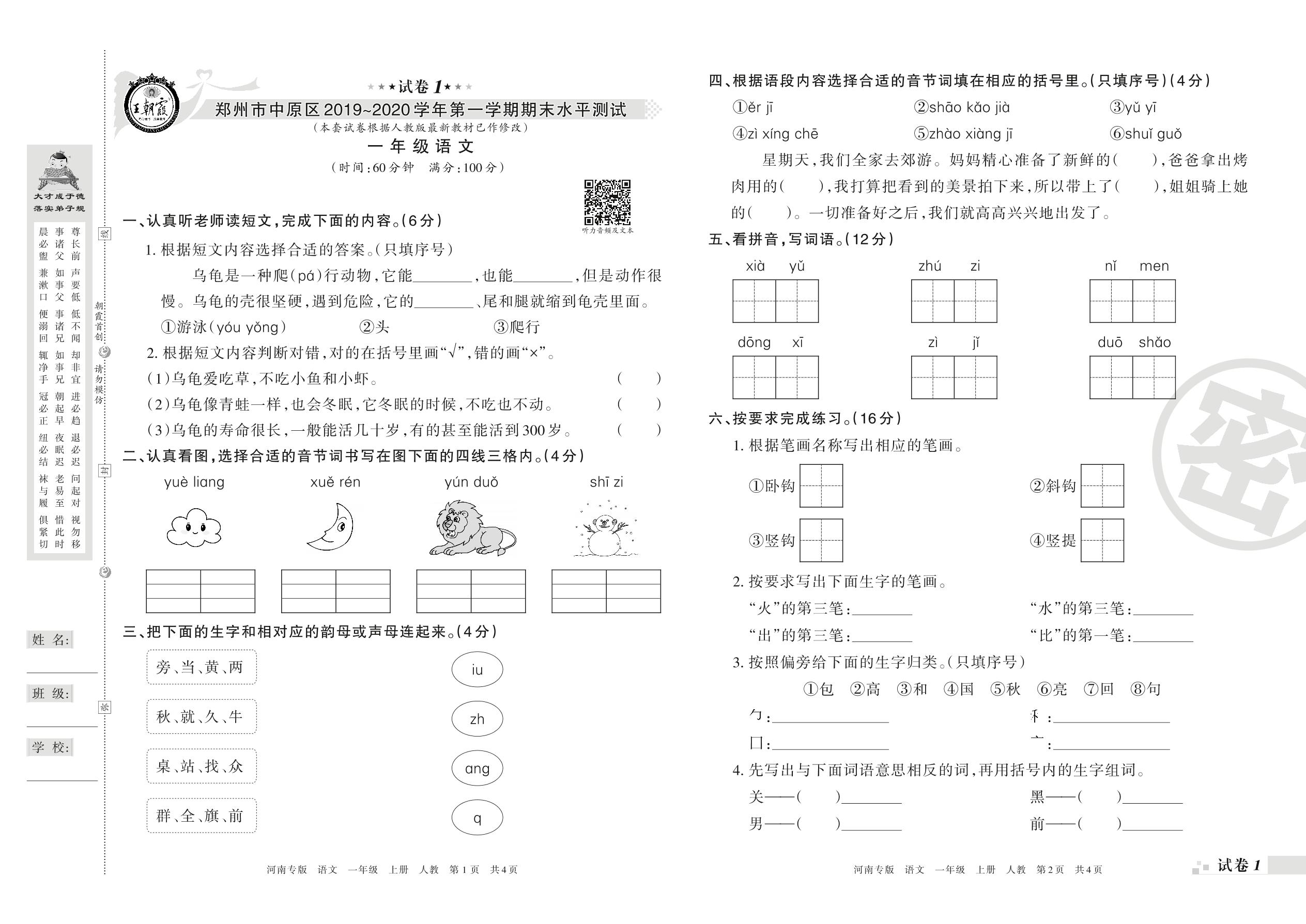 2019-2020学年第一学期郑州市中原区一年级语文试卷(人教版)【1】